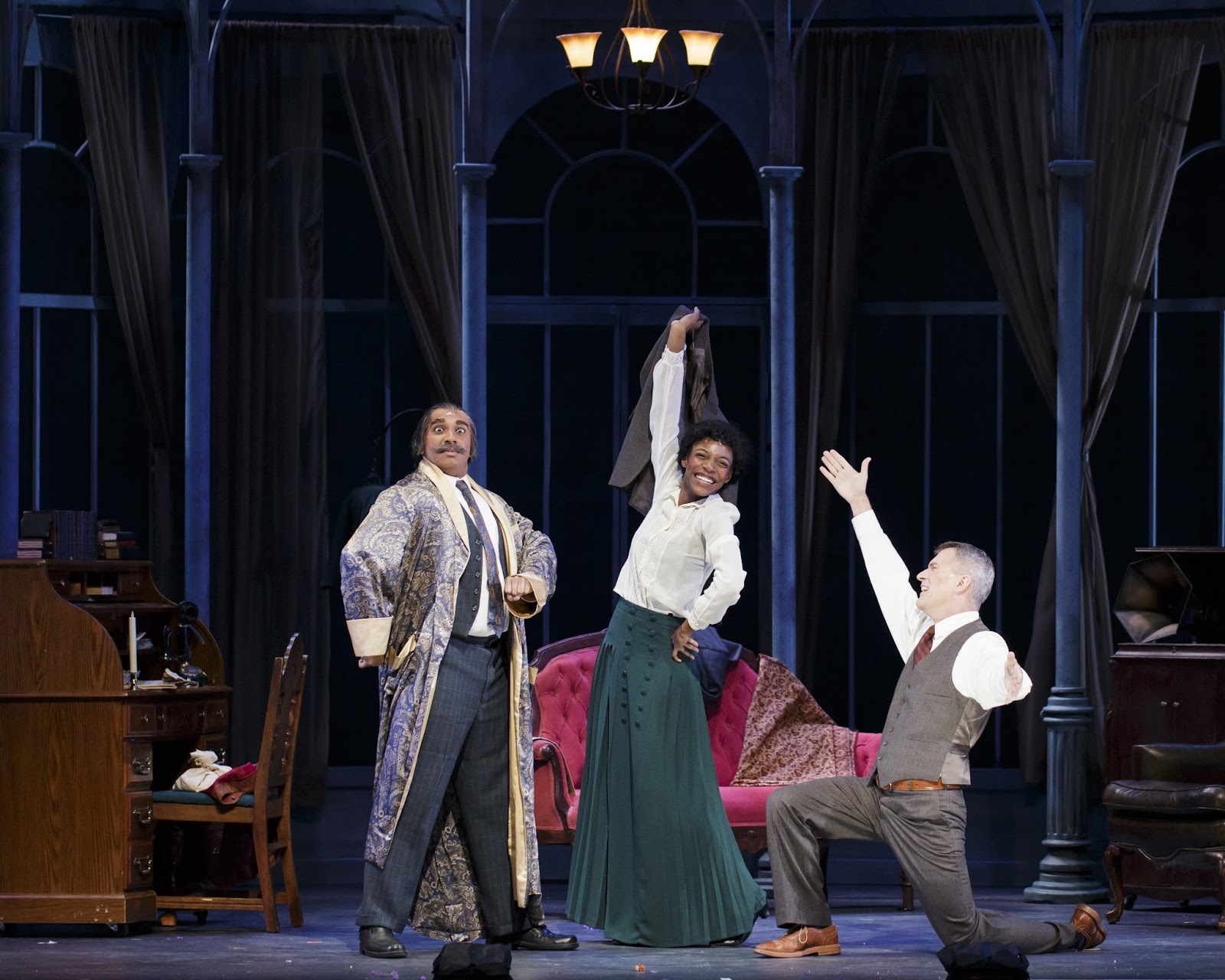 Stepping into roles that many stage and screen actors more famous than they have engrained in audience minds is not a small task for whomever tackles either Eliza or the Professor. Both Samantha Williams and Scott Solomon admirably succeed in taking their places among this illustrious cadre. As flower girl Eliza, Ms. Williams squeals, slinks, and sniffles her way to extra coinage and the attention of the nearby Higgins in the opening scenes. Her cockney is shrill and convincing, and she sings and dances with contagious energy. The subsequent, grueling vocal exercises she undergoes punctuated with her gobbling chocolates give way to an elegant, tall, and absolutely stunning lady whose signature I Could Have Danced All Nightis beautifully rendered in full, almost operatic voice. As an African-American playing Eliza, Ms. Williams naturally deepens the role by reminding us that the glass ceiling of this doomed palace world of 1912 restricts women and racial minorities alike. Her casting is thus brilliant on many levels.