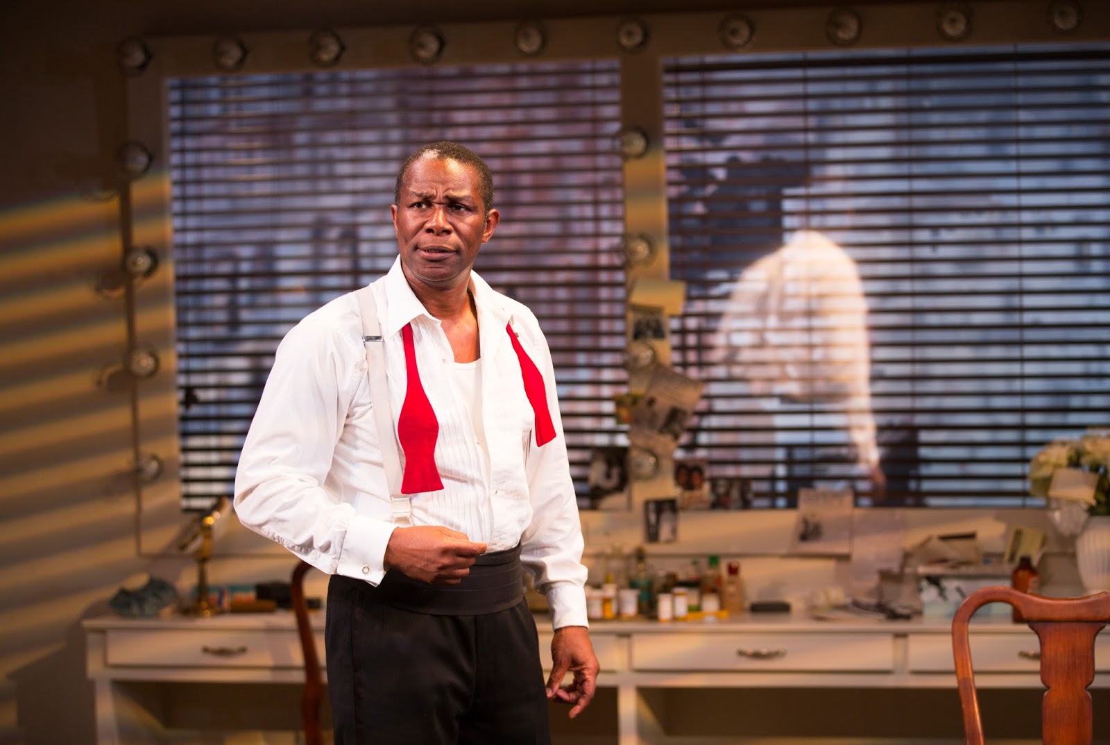 Mr. Thompson’s Louis is clearly proud of his lifetime of achievements, none more that seeing himself for the first time in a Loony Tunes cartoon as a trumpet-playing angel. “Can’t get any more famous than that,” he boasts in the biggest of smiles and sparkles. He is also deeply in love with his fourth wife of thirty years, Lucille, as we see in one of the more tender moments of the evening as our Louis tells with eyes near tears how his young wife made sure he had a decorated tree waiting for him in their hotel room after a Christmas Eve show, the first he had ever had in his life. Mr. Thompson is masterful in baring all sides of Louis Armstrong’s huge personality in authentic and believable fashion, all the time reminding us as he gingerly undresses his tux to his underwear and redresses to go upstairs in the hotel to his wife that he is old and tired, satisfied and frustrated, willing to die soon but eager still to keep living.