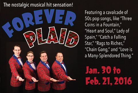 Forever Plaid continues in production by South Bay Musical Theatre through February 21, 2016 at the Saratoga Civic Theatre, 13777 Fruitvale Avenue, Saratoga, CA. Tickets are available online at http://www.southbaymt.com/contact/tickets.html or by calling 24 hours a day 408-266-4734).