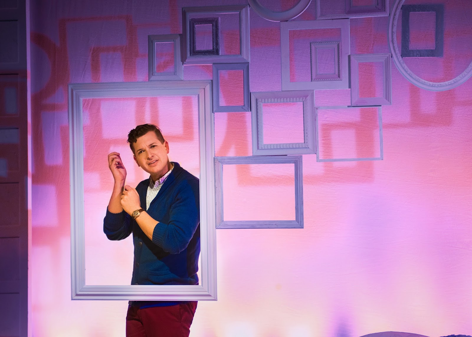 Devin Kasper has created a stunning yet simple setting on the small flat stage just a few feet from the first row. Most of the shops’ details are left to our imaginations based on Alex’s detailed, chatty descriptions. An elegant divan, a plush rug, and a dress form stand (that will have a big dancing role at one point) are engulfed overhead by a series of hollow picture frames of all shapes that climb on a diagonal across the back stage. To make the set really pop and to establish a basement mall setting, Keira Sullivan has created a fantastic and ever-shifting lighting design. Applause must also go to the exquisite timing, quality, and light-heartedness of Sara Witsch’s sound design. While Mr. Frank brings much innate talent and ingenuity to all his characters’ constantly changing expressions and voices, clearly he has been directed with great skill by Rebecca Longworth.