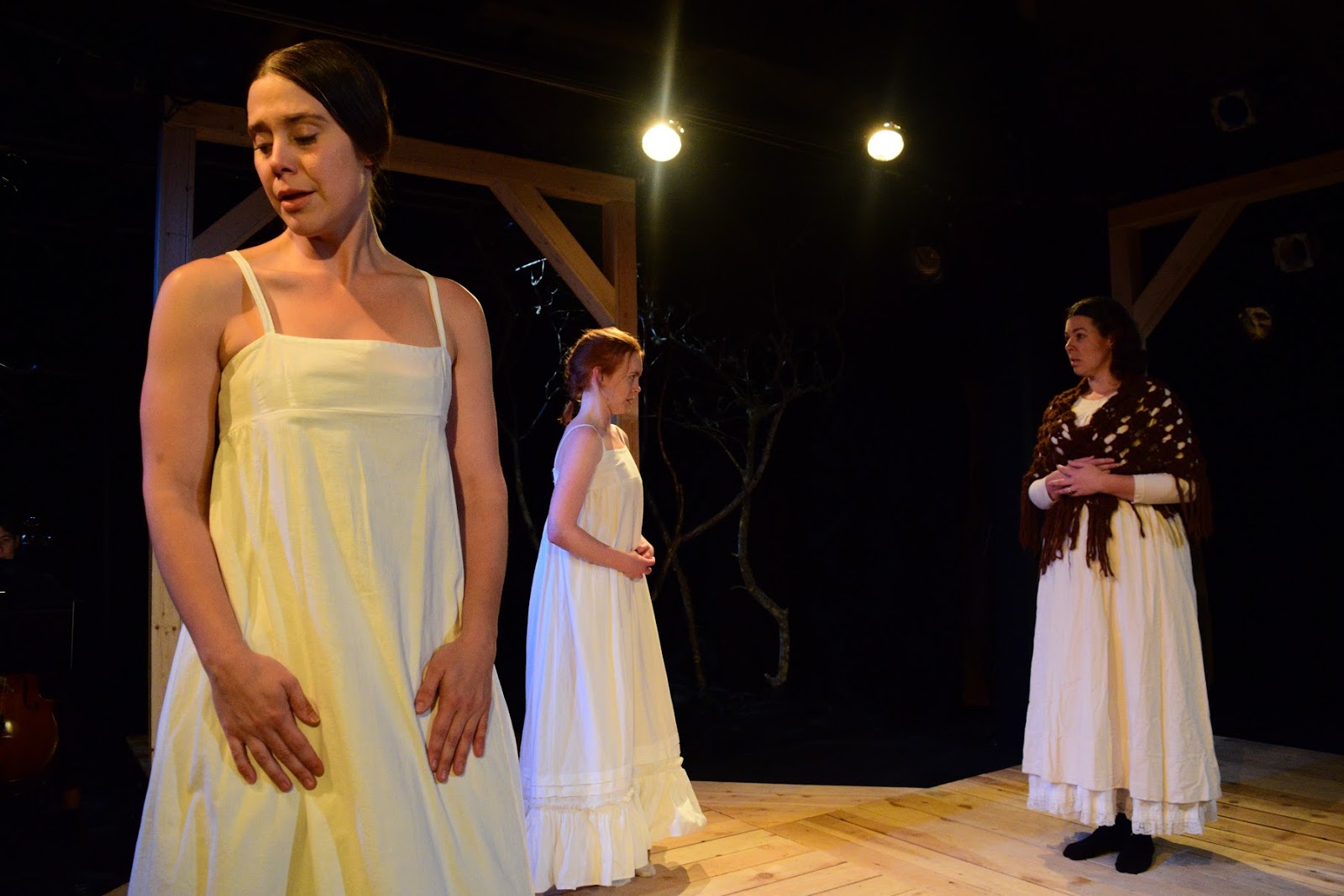 The cross-shaped, raised, plywood stage with four, single-paned door frames guarding each of its legs sets the stark scene, accentuated by a few background, skeletal trees and sustained, plaintive chords from a string trio in the shadows. With no props save one bucket of black stones and with actors in Amish-style clothing, the timing is ominously ambiguous. Is this Puritan New England akin to The Crucible, a present day isolated community in Idaho, or some post-apocalyptic group in a world full of religious fear and rule? San Francisco playwright Alan Olejniczak’s newest undertaking, Dominion, is an unsettling, creepy, and totally compelling look at a village whose male-dominant religion rules every aspect of the dreary, fear-laden lives of its inhabitants and whose parallels to our world of today are unnervingly too many. At Last Theatre presents this world premiere in a tight, tense ninety minutes with a cast that embodies with great skills the play’s harsh contrasts – both shining and shadowy — of what it means to be family and community.
