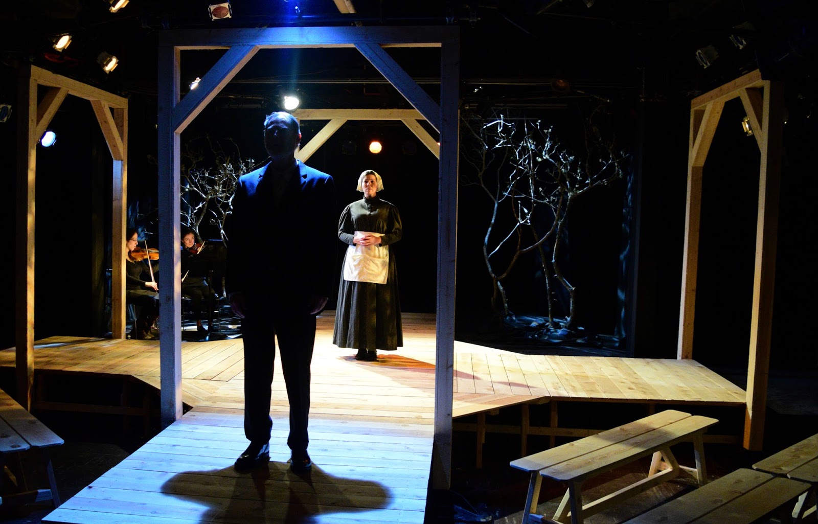 Rik Lopes directs this able cast with the sensitivity, precision, and conviction the script deserves. James Hunting has created the set that defines the mood and timelessness so central to the play’s impact, aided greatly by the shadows and pinpointed spotlights of Mike Riggs’s lighting design. Arthur Oliver’s costumes are stunning in their severity and beautiful in their simplicity. Finally, the original music of Charlie Gurke as played throughout on violin, viola, and cello accentuates the air of tension and foreboding while also allowing an opening of beauty and redemption to creep through.
