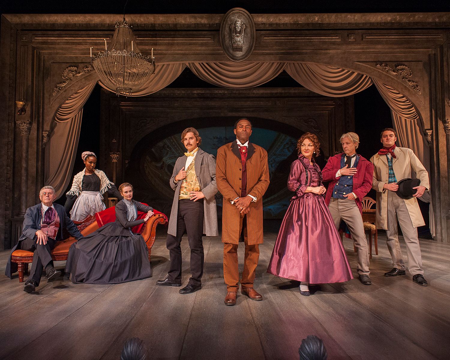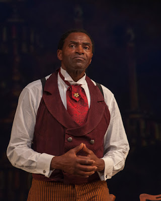 But remember he does; and we now find ourselves backstage in a rehearsal hall of 1833’s Coventry Garden where a group of actors are surmising all the ‘bump ups’ that will occur among them since their famed Othello lead, Edmund Kean, has fallen ill. Eleana Wright has magically transformed in barely an eye flash from Polish journalist to now a young English actress, Betty Lovell. She is joined by old and cantankerously raspy Bernard Warde (another quick change, this time by Richard Louis James from the elder butler of 1867 Aldridge); the absolutely elegant in billowing, purple gown actress Ellen Tree (Susi Damilano); and a young perky, pleasant actor Henry Forester (Devin O’Brien whom we earlier saw as a German-speaking-only houseboy of 1867 Aldridge). The son of the failing Edmund Kean, Charles (Tim Kniffin), is there, too, who is sure, along with everyone else, that the role of Othello is now his inherited right. But their French director, Pierre LaPorte, arrives bustling about in all directions announcing in an ever-so-coy, even mischievous manner that he has found an acclaimed actor from the countryside to play the Moor. When he says the name “Ira Aldridge,” several note they in fact have read his positive notices while the now-wide-eyed and slightly chuckling Henry admits he has actually seen Mr. Aldridge act.