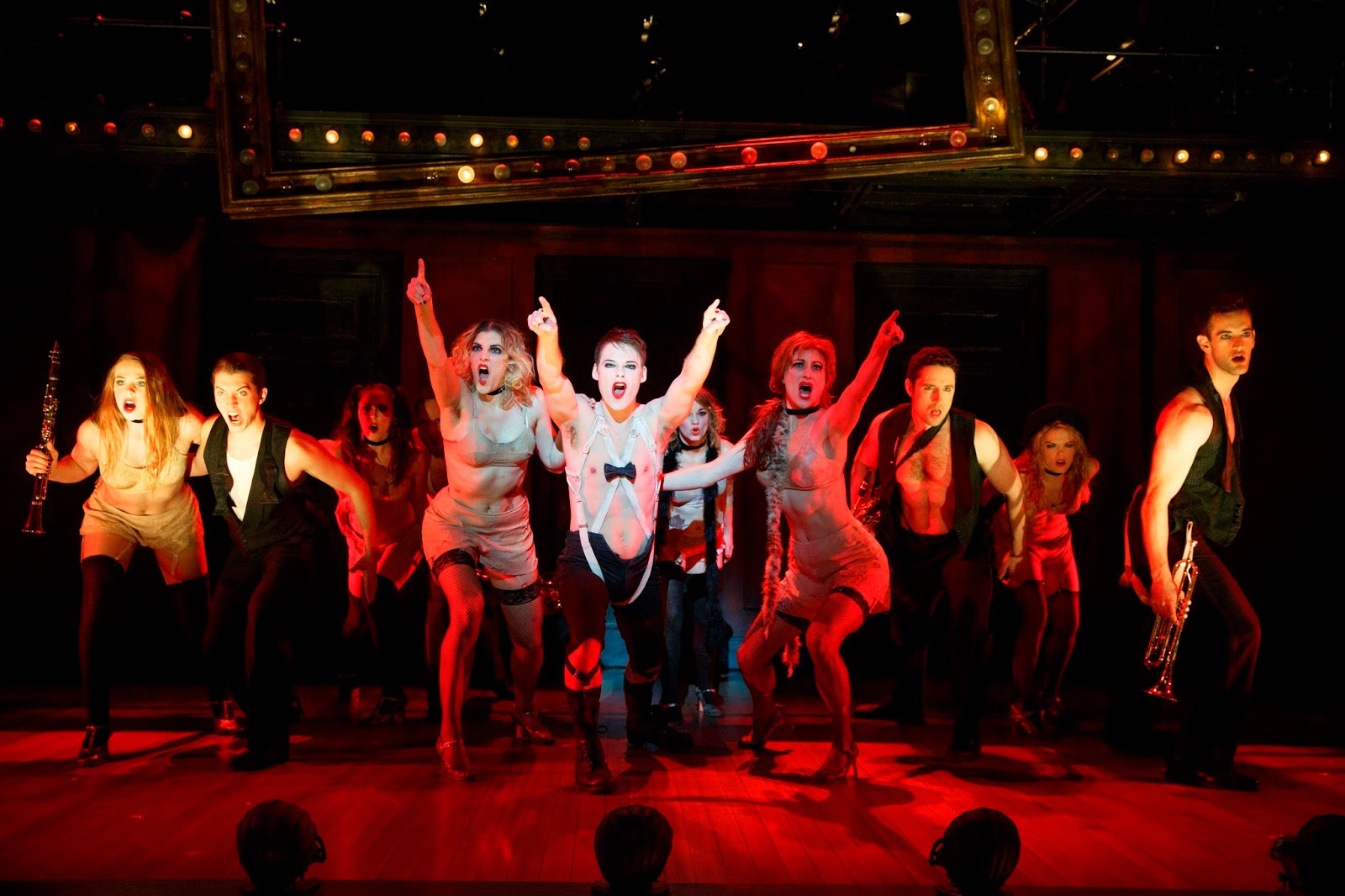 Always watching from a perch above or appearing suddenly in any one scene as a passer-by, a living prop, or a too-knowing observer, the Emcee is like a German everyman who is seeing and participating in both the frenzied world of complete, hell-bent freedom and the approaching dominance of Fascism. Randy Harrison (the young Justin Taylor in the long-running “Queer as Folk”) takes on the role made so famous by the likes of Tony winners Joel Grey and Alan Cumming and brings his own uninhibited, fervent interpretation as well as a singing voice that can sizzle, snarl, and seduce as needed. He leaves all restraints behind as he, Lulu (Dani Spieler) and Bobby (Leeds Hill) bring the house down with their “fiddle-de-dees” and XXX-rated shadow play in “Two Ladies.” He is the voice of repulsive anti-Semitism in his duet with a gorilla girlfriend (Aisling Halpin), “If You Could See Her,” (luring us in first with a song seemingly about tolerance); and he is the citizen listening with intrigue to the scratchy recording of a young boy singing the Nazi anthem, “Tomorrow Belongs to Me.” His ghostly voice in “I Don’t Care Much” rings with echoes of memories of what was and is full of pain and defeat of what now is. And when we see in the end who the Emcee really represents and thus what becomes his fate, an audible, collective gasp erupts across the audience, followed by stunned silence except for scattered sounds of soft crying.