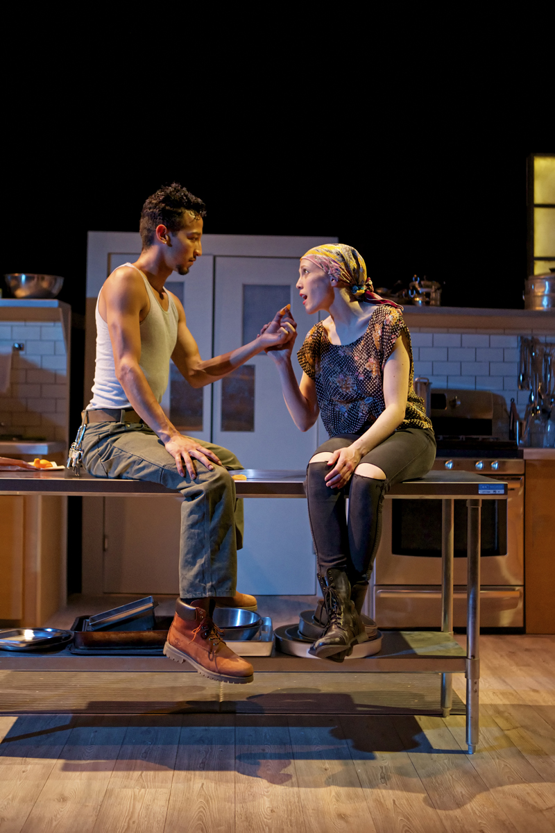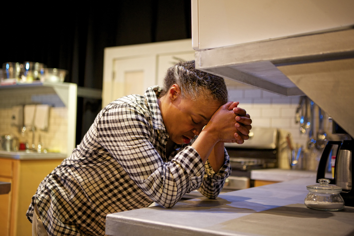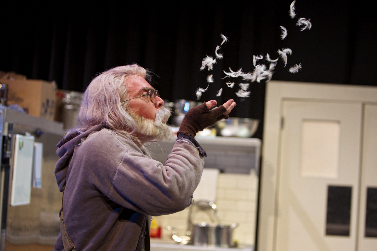 Shelley is a basketball-playing nun with a beloved cat named Pumpkin who with a grin eschews the expected black and white outfit but who believes so much that cleanliness is next to holiness that she arrives every morning at the soup kitchen (which she manages) to clean again what the night janitor has already done. As Shelley, Cathleen Riddley never seems to stop chopping, wiping up, and just plain moving fast – that is, except when she pauses with clasped hands in front of the microwave, her chosen alter for timed prayers (one minute now, goal of two minutes soon). But for some reason, those meditations seem harder for her to pray than one would expect from a woman devoting her full life to her Catholicism.