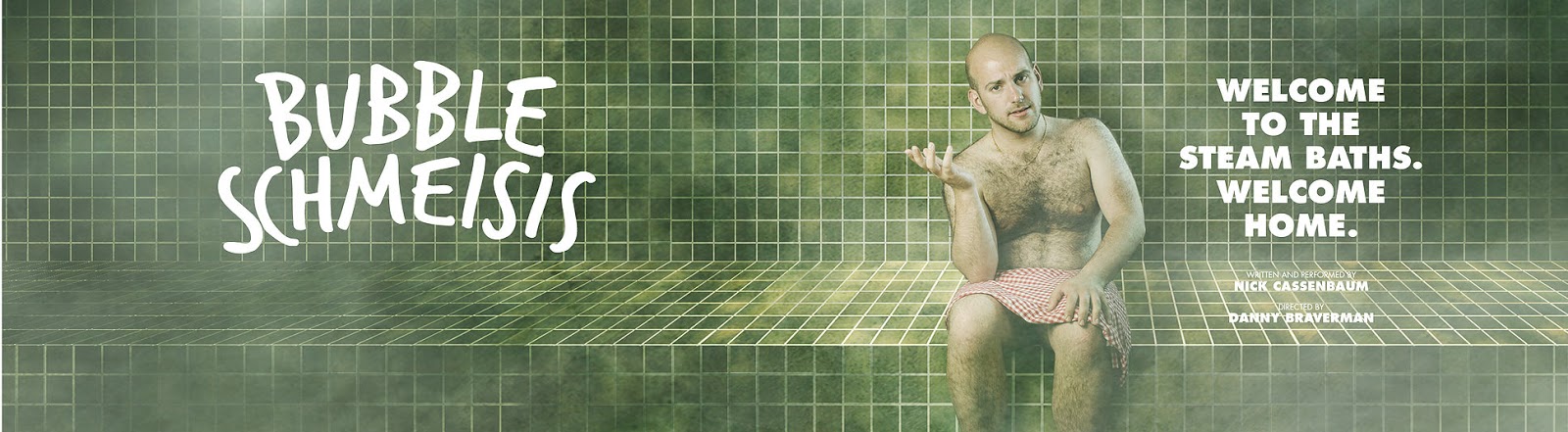 Standing before us in terry-cloth robe and a long, cotton wrap down to his bare feet, Nick Cassenbaum begins his Bubble Shmeisis (Yiddish for grandmother’s story or tall tale) by inviting us to take longs breaths in and out, something we will be asked to repeat several times during the upcoming hour. In between our collective moments of calm, Nick takes us along as he recounts going with his aged grandfather, Papa Allen, to the last, remaining schvitz haus (“sweat house” or bath house) in East London. Once there, in a sea of wrinkled, Jewish men many decades older than he, Nick tells us how he totally unrobed and got schmeised (washed with a large, horse-haired brush and soap) by one of them – something he reenacts for us but in this case, by a selected audience member closely matching the appropriate age of one of the alter cockers.