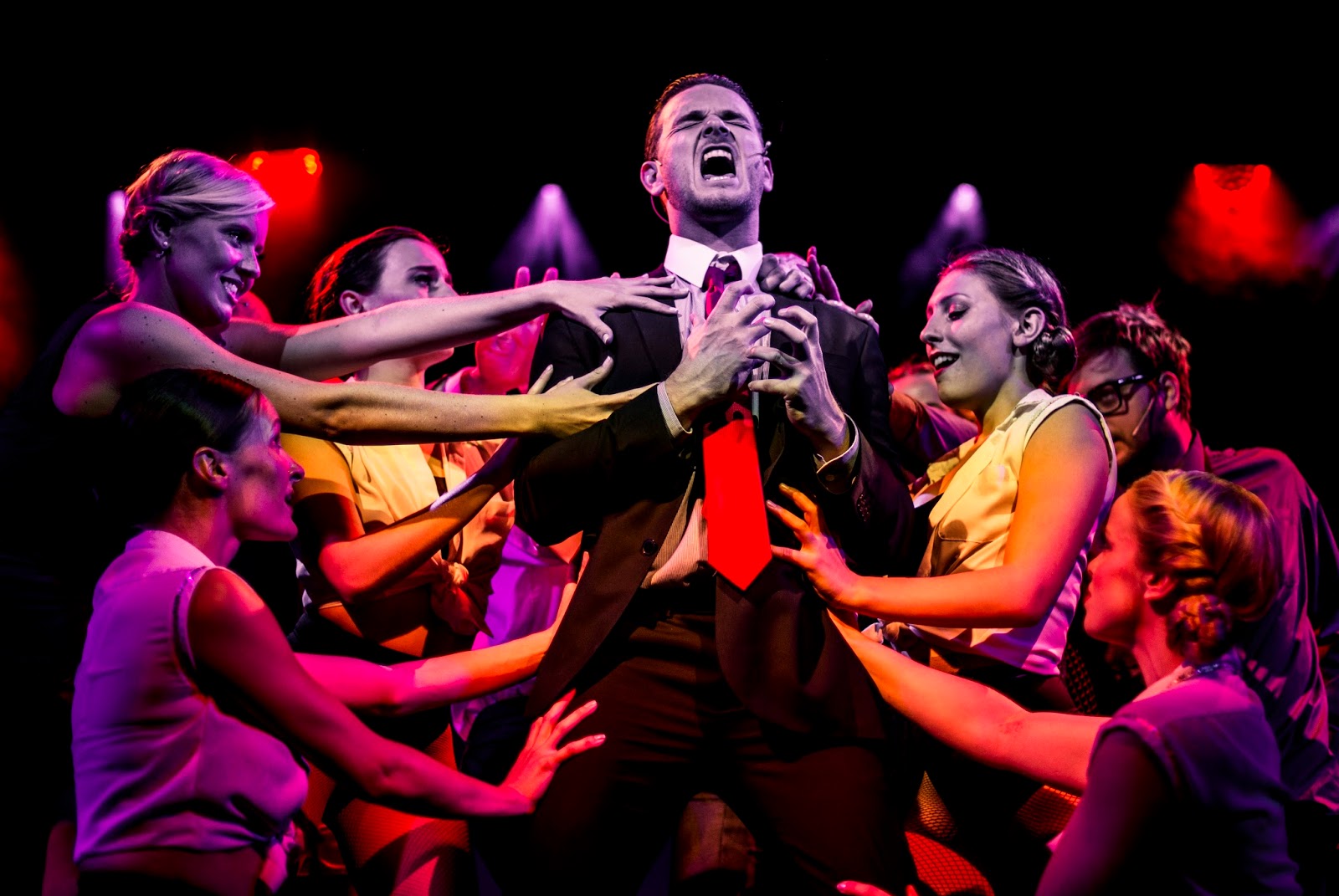 The bulk of the musical now becomes each person, often reluctantly and with initial resentment, telling his/her life’s story, with the other hostages slowly starting to listen and even to offer help and advice. First up is soft-spoken, shy Rhodri, a low-level, never-to-rise-in-the-ranks sales guy who happens to have big debts due to a love for gambling. Jarrard Richards brings pleasing vocals full of spirit and clarity as he bursts into “The Lottery Song,” fully supported by four scantily clothed chorus girls with large lottery balls. He blasts away with new-found swagger, “I’m waiting for my balls to drop.”