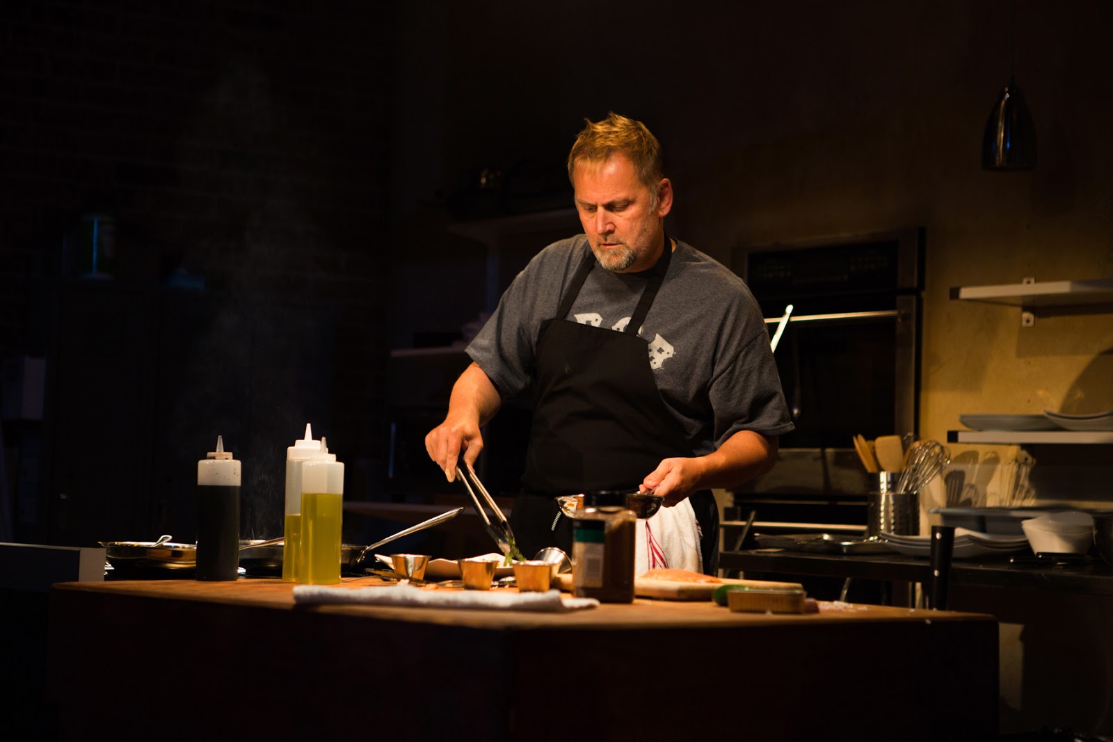 The cast members of Searedabsolutely burst with both subtly nuanced and rambunctiously bold flavors in their individual and collective performances. Brian Dykstra is gigantic in stature and in kitchen presence as the chef in command. He tends to speak in three-word pronouncements (“Vegans are idiots” … “Money is fabrication”). He lures in his listeners with a sudden smile that may disappear a few words later as he makes proclamations like “People suck … They do suck … but food doesn’t.” When Harry is alone cooking over the hot stove, his slow, steady dance becomes a ballet of precise moves. But when he feels that his domain is in threat by too much talk of money and not enough of the merits of olive oil, his ire can quickly rise to near explosion as witnessed by his widened eyes, flailing extension of his big hands, or a mammoth body stomping and stamping like a two-year-old in a tantrum.