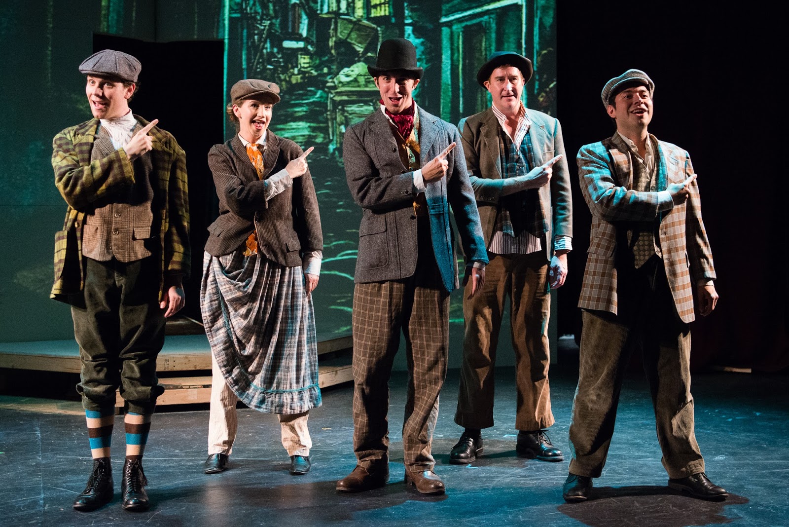 Another songster with penetrating tones that have big grins, quick wit, and a bit of devilishness all built into the delivery is Andrew Mondello as Wiggins. This ruffian of the streets, along with his gang of four, runs interference and carries out needed sleuthing assignments for his boss, Sherlock himself. My Fair Lady (which premiered in 1964 a year before Baker Street took to the stage) is once again recalled as the numbers that Wiggins and his “Irregulars” deliver in choreographic style and hilarious song look and sound a lot like those of Alfred P. Doolittle and his Cockney pals. In “Leave It to Us, Guv” and “Roof Space/Sixty Long Years,” Wiggins and the Irregulars (Tobiah Richkind, Alison Quin, Stephen Vaught and Jesse Cortez) sing with spunk and pizzazz and clown around in well-delivered choreography (designed and directed by Cindy Goldfield), generating a lot of energy for the show as well as chuckles from the appreciating audience.