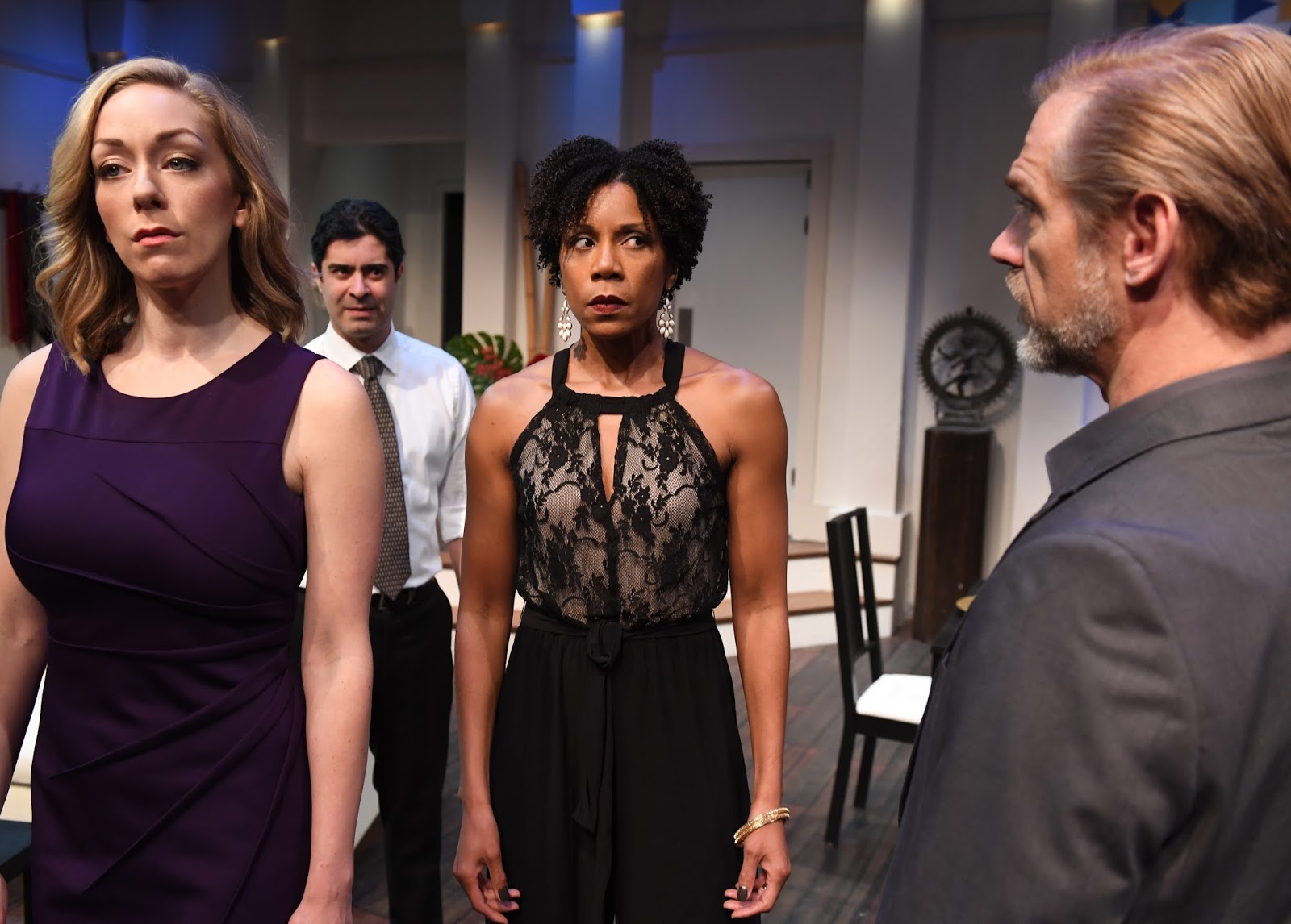 If in the midst of the salad course at a dinner party with friends, friendly chatter begins to be peppered by the topics of a) religion, b) ethnic origins, c) politics, then politely remember you left something burning on the stove at home and dash out immediately. At least, that could be one lesson learned while watching the engaging, explosive 2013 Pulitzer Prize for Drama, Ayad Akhtar’s Disgraced. More importantly, when put into the capable hands of the excellent ensemble assembled by The Stage under the able direction by William Ontiveros, Disgracedimplores us each to delve deeply to find and admit the prejudices and stereotypes that lie somewhere buried within – no matter how hard we try to deny them.