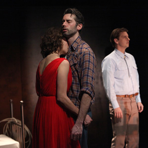 Equally phenomenal is Andrew Pastides as Eddie, especially in the way he captures the multiple sides of this roaming cowboy. There are times he is like a gangly teenage boy with lovesick eyes and an aw-shucks demeanor. Other times he is a roaring, screaming monster full of threats and possible violence. His nervous, twitching energy springs forth through incredible physical feats of springing from a squat to full attention in a flash or of a mid-air, somersault leap onto the bed. He also often resides for long periods on the floor with long legs twisting in knots, dangling in the air, or hanging onto the nearby bed. In Eddie can be experienced much intensity, mystery, and something close to likeability; but with Eddie comes also explosions of slammed doors, stomped boots, and an angered voice that startles and scares.