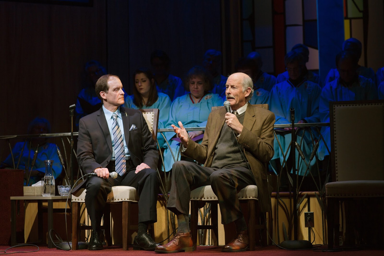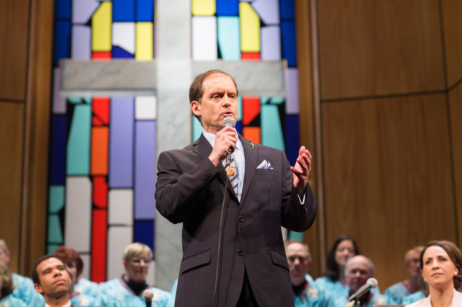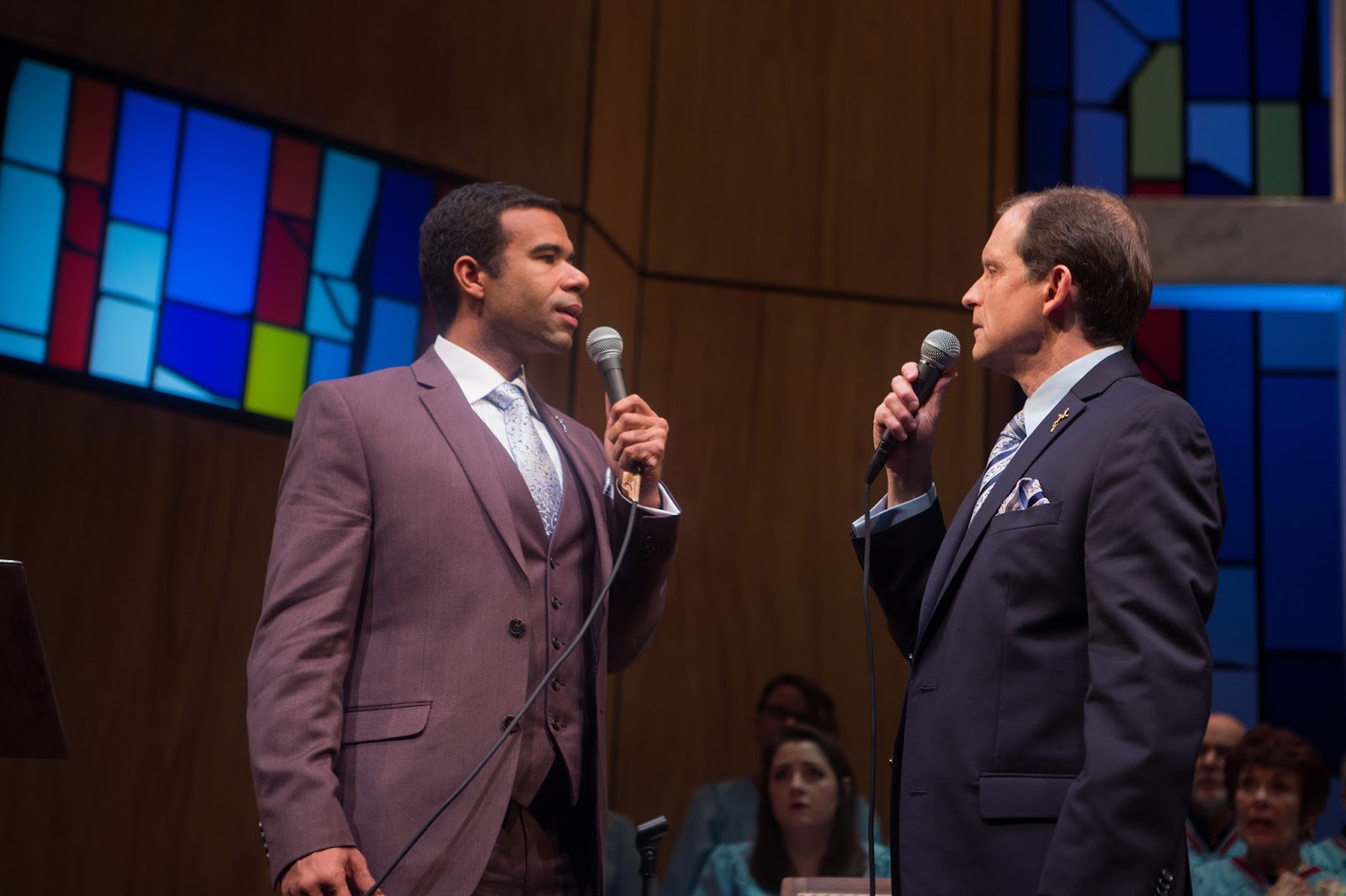 Eerily, it does immediately feel as if we are in a church rather than the San Francisco Playhouse that we thought we had entered (although maybe the glasses of wine many of us still have in our hands is a dead give-away of the true location). Before us is another incredible, Bill-English-designed set that smacks of something seen when flipping the TV remote and landing on a mega-church service. Light-colored, paneled walls are punctuated with deeply hued, stain-glass windows – one embedded with a huge cross — and large video screens show soothing scenes of clouds, fields, and forests. A sixteen-person choir enters in cross-embroidered robes and begins gently to sing and sway the hymn “Holding Onto God’s Unchanging Hand,’ soon followed by rhythmic clapping and testifying through their contagiously engaging voices, “Catch on Fire.” By the time the Pastor steps forward to ask everyone to bow heads for prayer, I look sheepishly around the theatre audience to see if that means us, too.