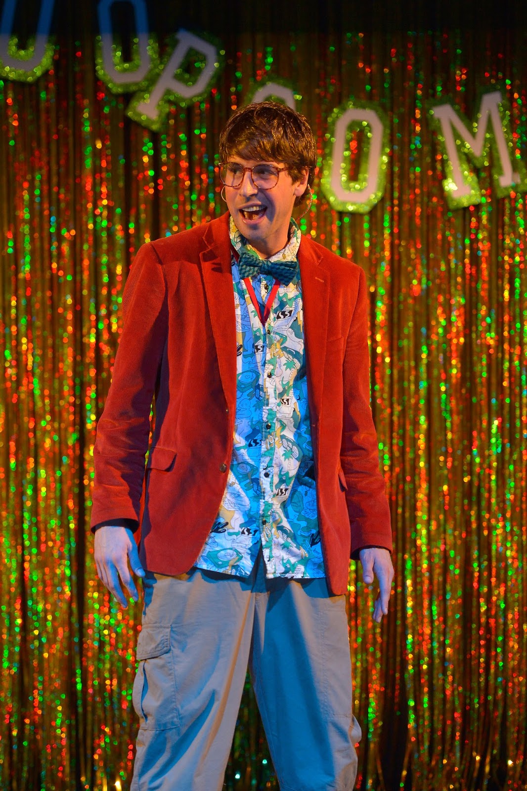 Jeremy Kahn pretty much steals the show in his spot-on portrayal of the baggy pants, aw-shucks D (for those Shakespeare buffs, the King Duncan of the cast), who can hardly shut up telling the twins how excited he is that he and his cystic-fibrosis-suffering brother (also played by Mr. Kahn) get to be their dates at the Hoopcoming dance. As he nervously shifts the weight of his tall body with his long arms continually gyrating through the air while enthusiasm exudes his every pore, there is little he does not reveal to the sisters. Without hesitation, he literally shouts with glee to the now-listening sibs about his fatal allergy to tree nuts and the EpiPen he always wears around his neck, ready to plunge its medicine quickly into his thigh if a walnut touches his lips. Maybe he should have listened to his mother who told him not to talk so much.