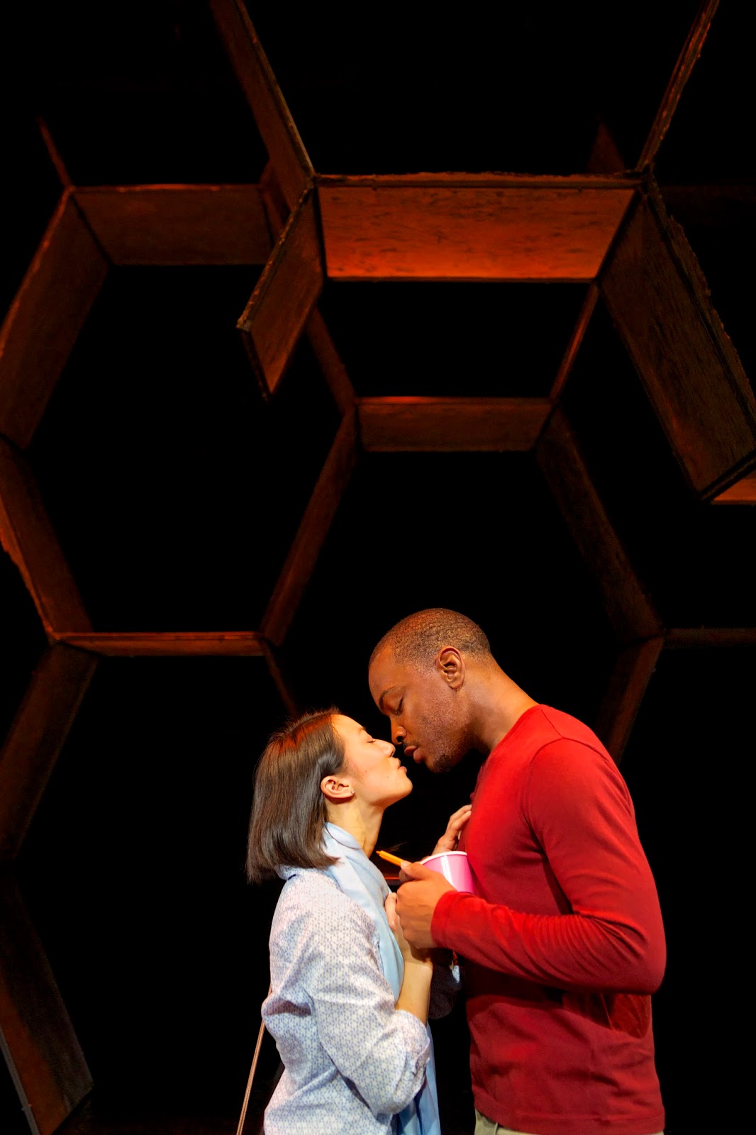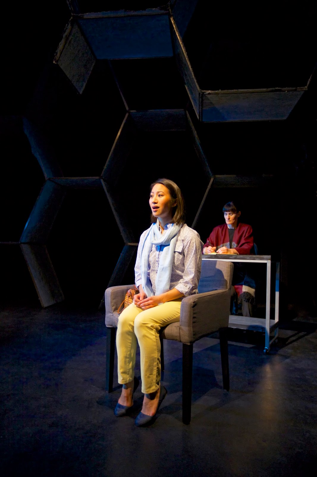 But in any case, there is no argument that David K.H. Elliott has created a lighting design and James Ard a sound design that are both stellar in the telling of these often-surreal sequences. Each has out-performed for a theatre as small as the space before us, and their ingenuity enhances the overall experience immensely. Lynne Sofer’s contributions as dialect coach certainly pay off for each of the actors, from the drawling Man from the South to the incredible verbal acrobatics of Liz to the Korean accents which sound very authentic to the untrained ear. Maya Linke’s most visible element of the scenic design (a large cellular model in the background … or is it a honeycomb?) is part of the play’s unexplained, mysterious symbolism, but her other elements of the many changing scenes easily flow in and out and work beautifully (as also do Michelle Mulholland’s costumes).