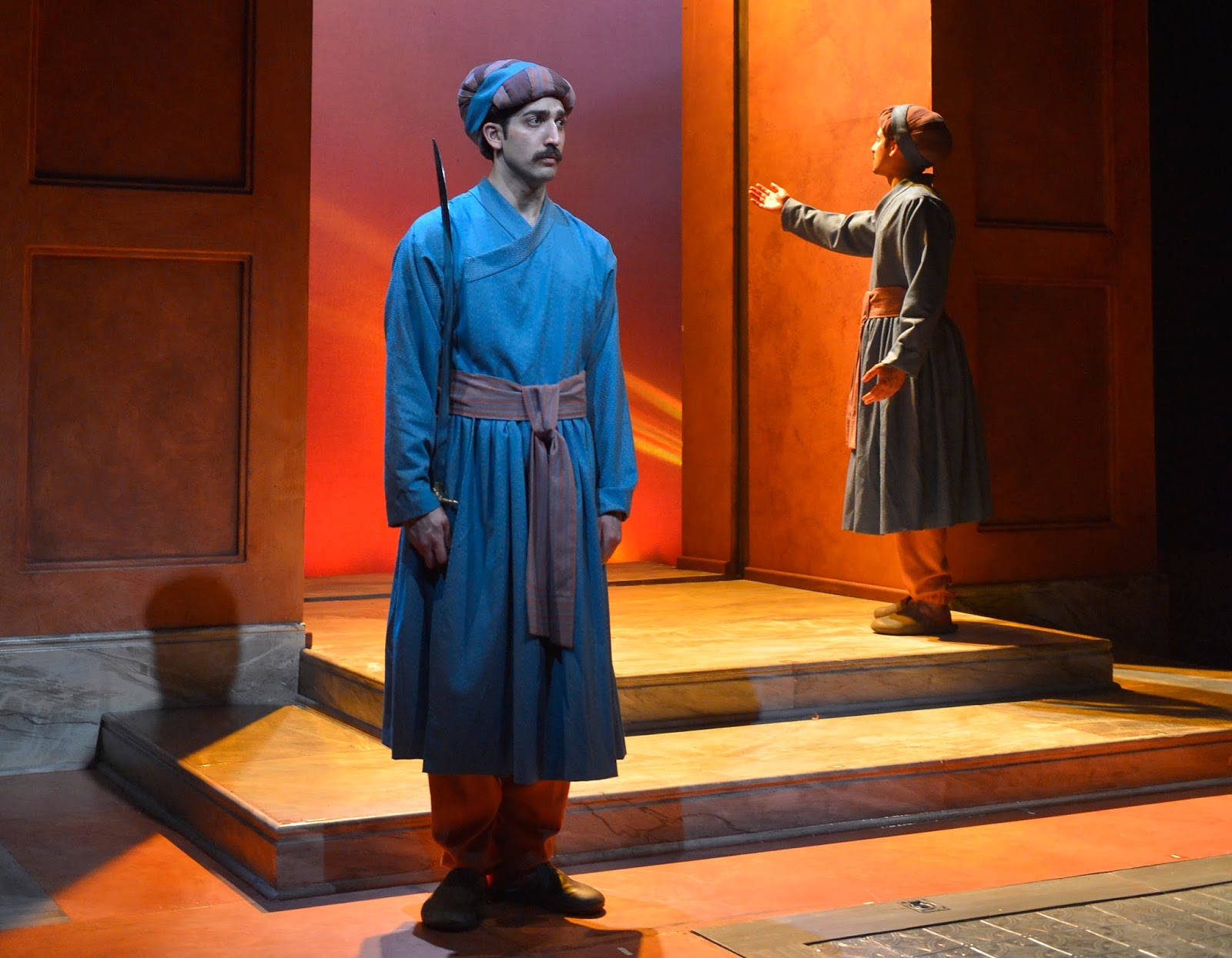 Jason Kapoor and Rushi Kota are nothing short of shockingly outstanding in their roles as Humayun and Babur — shocking in that they are able from the first to the last minute to remind us that what appear as good people can actually do terrible, unspeakable acts against each other.  Bad people we read about in the paper or online are not necessarily demons with horns.  They may – and perhaps are often  – like these two before us who show many signs of love and caring, who dream fantastically of inventive schemes, who are funny, and who can come to genuine tears of regret for acts they commit.  Each of these actors performs individually in ways that constantly remind us that a son, a friend, and a potential love of someone is behind those slight smirks and big smiles, those eyes full of mischief and of curiosity, and those muscled arms seemingly more ready to hug than to harm.  By their performances and interpretations of their characters, these two actors do not let us forget the fine line between good and evil and the fuzzy grayness that boundary can have.