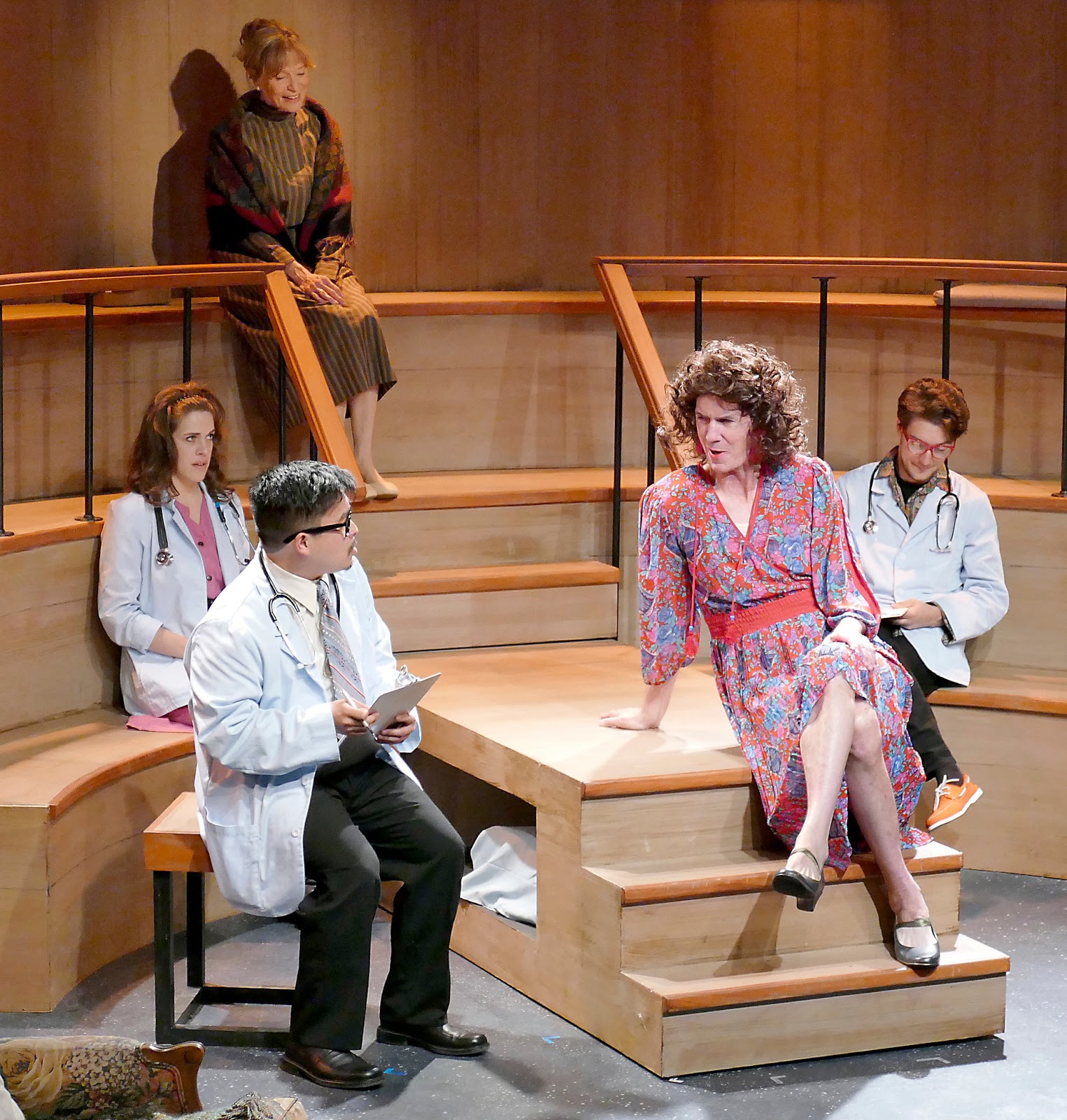 Jeff Rowlings has created a set (along with accompanying lighting) with tiered, arena seating like one might find in a medical classroom, complete with a drawer that opens out of the stairs to become a bedroom. Fronting on two corners are simple but effective scenes of Mrs. Donaldson’s home and Dr. Ballantyne’s office. Costumes by Callie Floor produce their own laughs as well as perfect the individual characterizations created by each actor. Drew Yerys’ sound design lets us hear Mrs. Donaldson’s heart while also rocking in fun to the echo-chamber sounds of a karaoke bar.