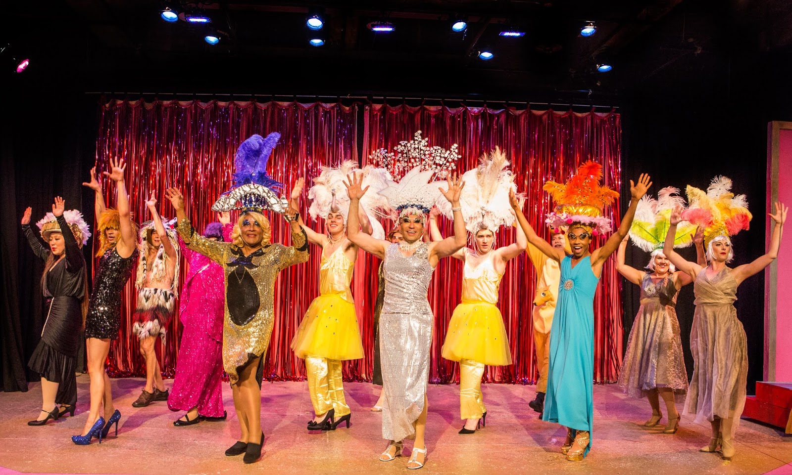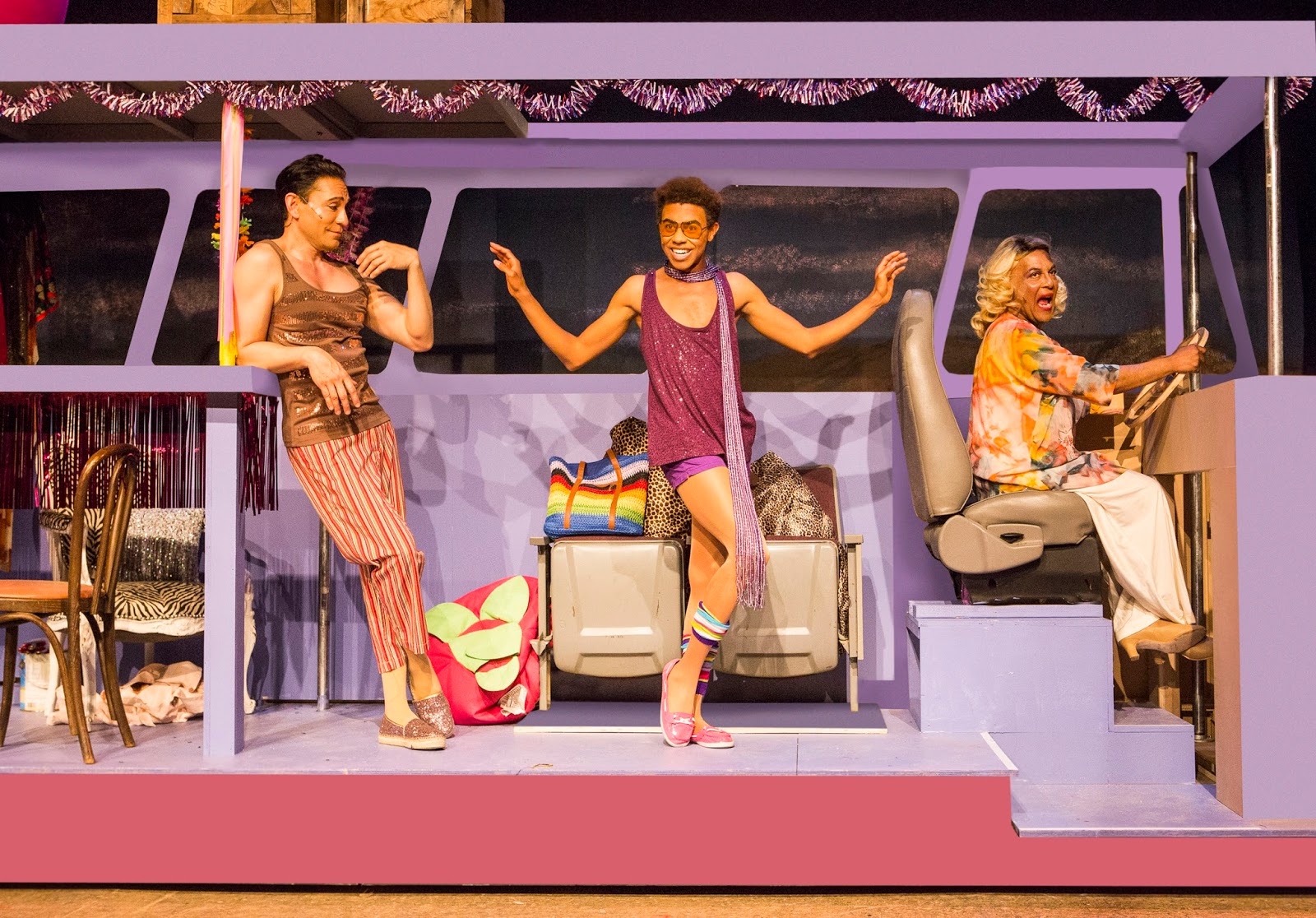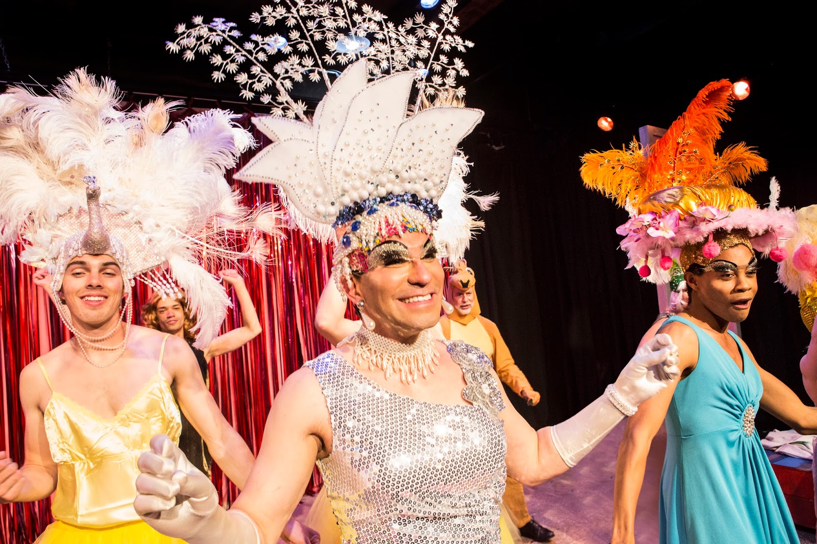 It’s Pride 2017 in San Francisco; and what better way to celebrate than with fabulously attired drag queens, shirtless twinks, singing divas in sparkly wigs, and a garishly decorated school bus named Priscilla? Oh, and there are kangaroos, the Village People, disco-dancing dandies, and pop music made famous by everyone from Cyndi Lauper and Burt Bacharach to John Denver, Diana Ross, Petula Clark, and Donna Summer. The juke-box musical Priscilla, Queen of the Desert, The Musical— originating from Sydney in 2006 before making its way around the world with successful, award-winning stops in London and New York – plops its high heels in grand style onto the tiny stage at Eureka Theatre sporting reams of glitter, chiffon, and spangles in a production big in heart and galactic in campy fun by the oldest LGBT theatre in San Francisco, Theatre Rhinoceros.