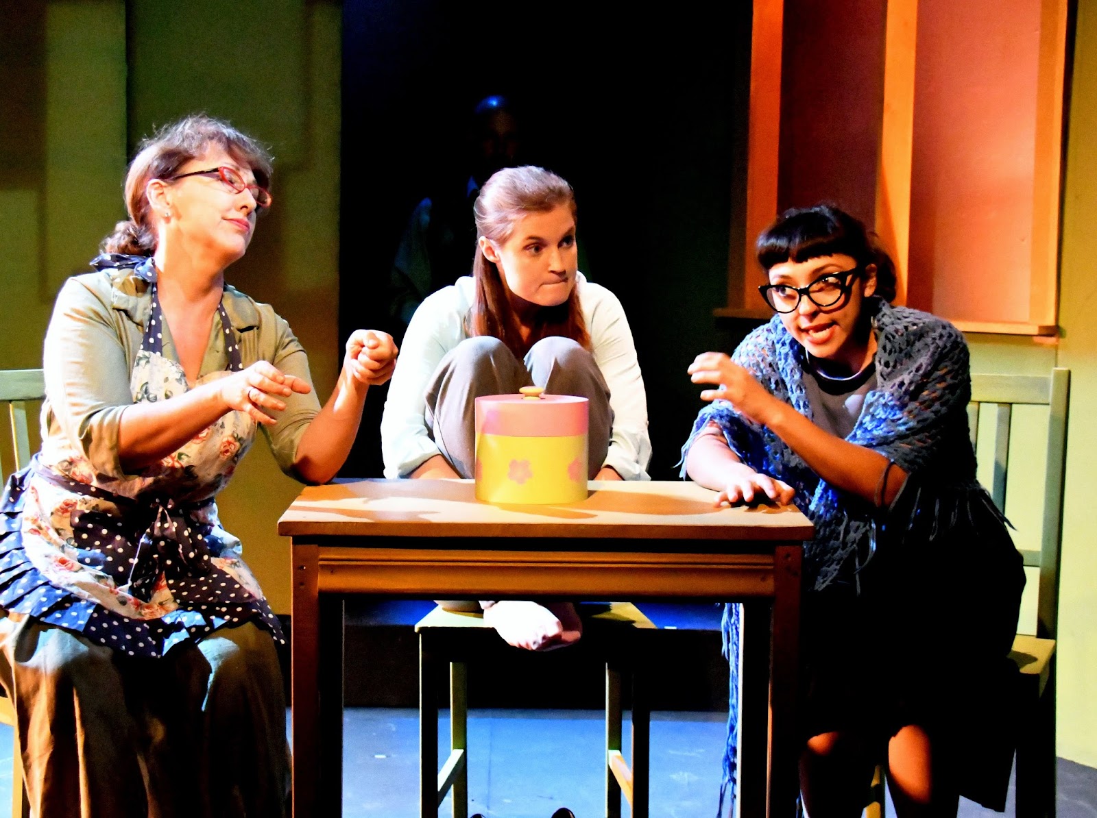 Peering eyes from a corner of the stage are often watching and reacting in various intensely yucky expressions to the memories of Li’l Bit with her Uncle Peck. Besides their silent, leering observances, a “Greek Chorus” of three plays a wide range of roles – everything from the bizarre set of relatives worthy of much loathing to the unseen singers of the radio harmonies of the 1960’s (“In the Still of the Night,” “Surfer Girl,” etc.) that Li’l Bit likes to tune into while driving along with her Uncle on the back roads where he lures her.
