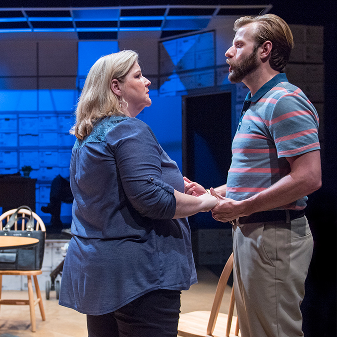 The overload of all the Caroline’s of the foster care world is illustrated vividly in the scenic design of Kate Boyd. Labeled boxes that surely contain thousands of pages of case notes and court pronouncements are the bricks of Caroline’s office walls and are even the foundation on which the raised stage sits. The costumes of Callie Floor clearly highlight the personal characteristics of each person — from the uptight-upstart of a boss Cliff to the too-pleasant-to-be-believed Pastor James to the organized-to-a-‘t’ Caroline.