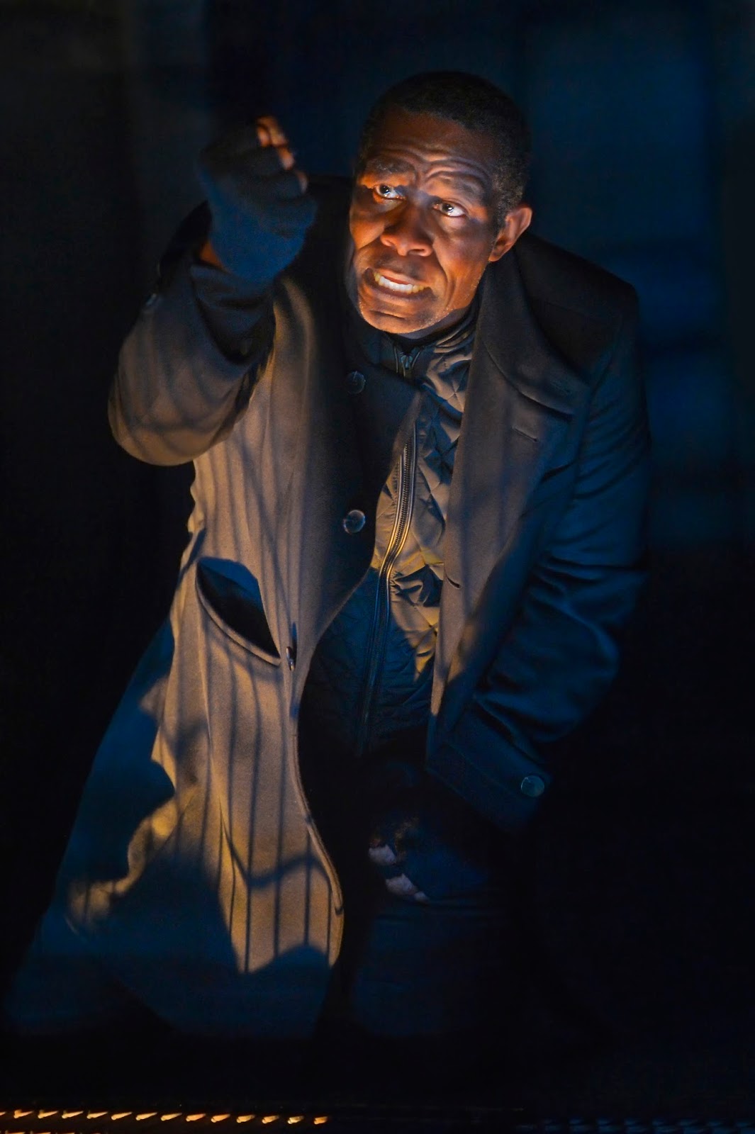 Surrounding John Douglas Thompson is an equally impressive cast, from minor to major roles. When we meet Queen Gertrude, the slightly up-tilted head of Domenique Lozano ensures her eyes lower to look in slight disdain at all those lower in caste than she. Her face puckers in pride as she listens to the royal decrees and braggadocio of her new husband and former brother-in-law. Later as her own guilt makes its way into her now wrinkled face, she degenerates before us into a queen barely holding onto her own sanity while trying to control and console those around her who are fast losing theirs. Ms. Lozano is superb in every respect as the queen whose own doom is only a matter of time, as can be seen in eyes that increasingly shout the fear felt within.