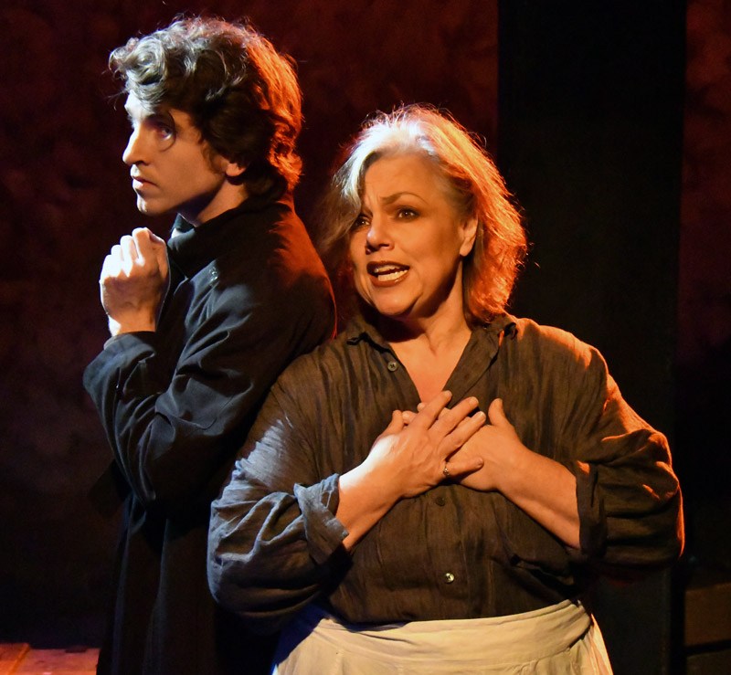 Rachel Richman plays the inn’s barmaid and resident prostitute, Aldonza, whom Don Quixote immediately dubs as his life-long, sworn love, Lady Dulcinea. When in “It’s All the Same” she describes her life of loving too many men “with hatred burning in my breast,” Ms. Richman’s voice is both seductively sinful and pitifully innocent, both madly insolent and yet dutifully worthy of sympathy. She gradually peels away the layers of disbelief and resistance to this kind but foolish knight’s adoration and his sense of unrelenting hope when there should be none, joining with Sancho in admitting “I Really Like Him.” Ms. Richman continues transforming in believable and moving ways her Aldonza, until in the end once a prisoner again, she leads her fellow condemned in the final, moving “The Impossible Dream” as Cervantes is led away to the fate of the real, Inquisition trial he faces. Kudos goes to Ms. Richman for a performance displaying life-justified harshness and hate but also new-found courage to love and be loved.