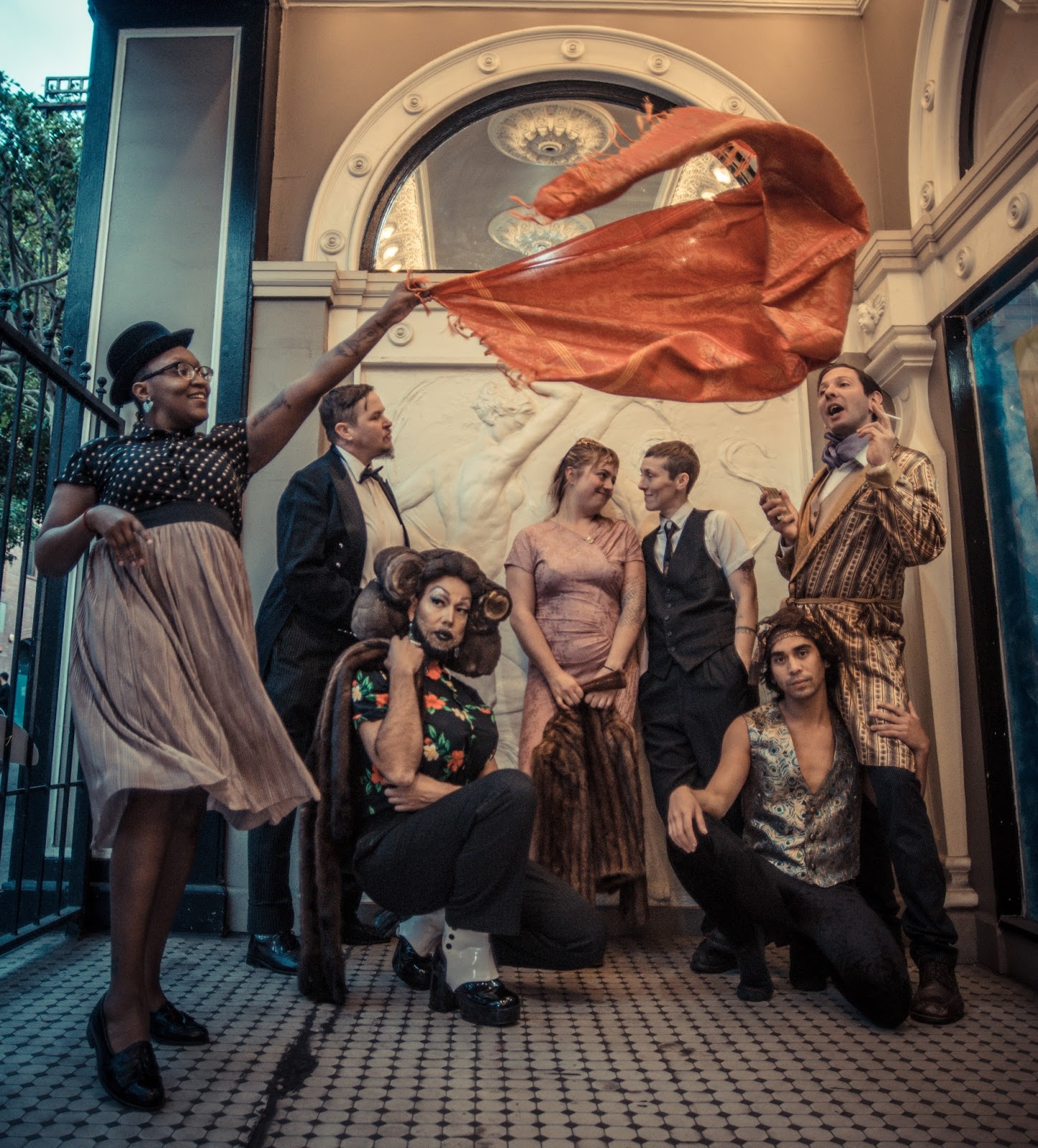 In full black dress and Spanish veil, Miss José Sarria (J. Miko Thomas who also plays Two-Spirit) meets us outside what was once the famed Black Cat Café where she sang in full drag and helped fight in court for the legal right of gays and lesbians to gather in such places. As the walk progresses, we will eventually visit the sites and hear about other, now-defunct watering holes and performance venues that were places of social refuge and of employment for the queer and cross-dressing community – places like Mona’s 440 Club and Finocchio’s. Re-enacted performances from these venues as well as from The Palace where the famed Cockettes drew crowds by the thousands in the early 1970s are a part of the afternoon’s outing.