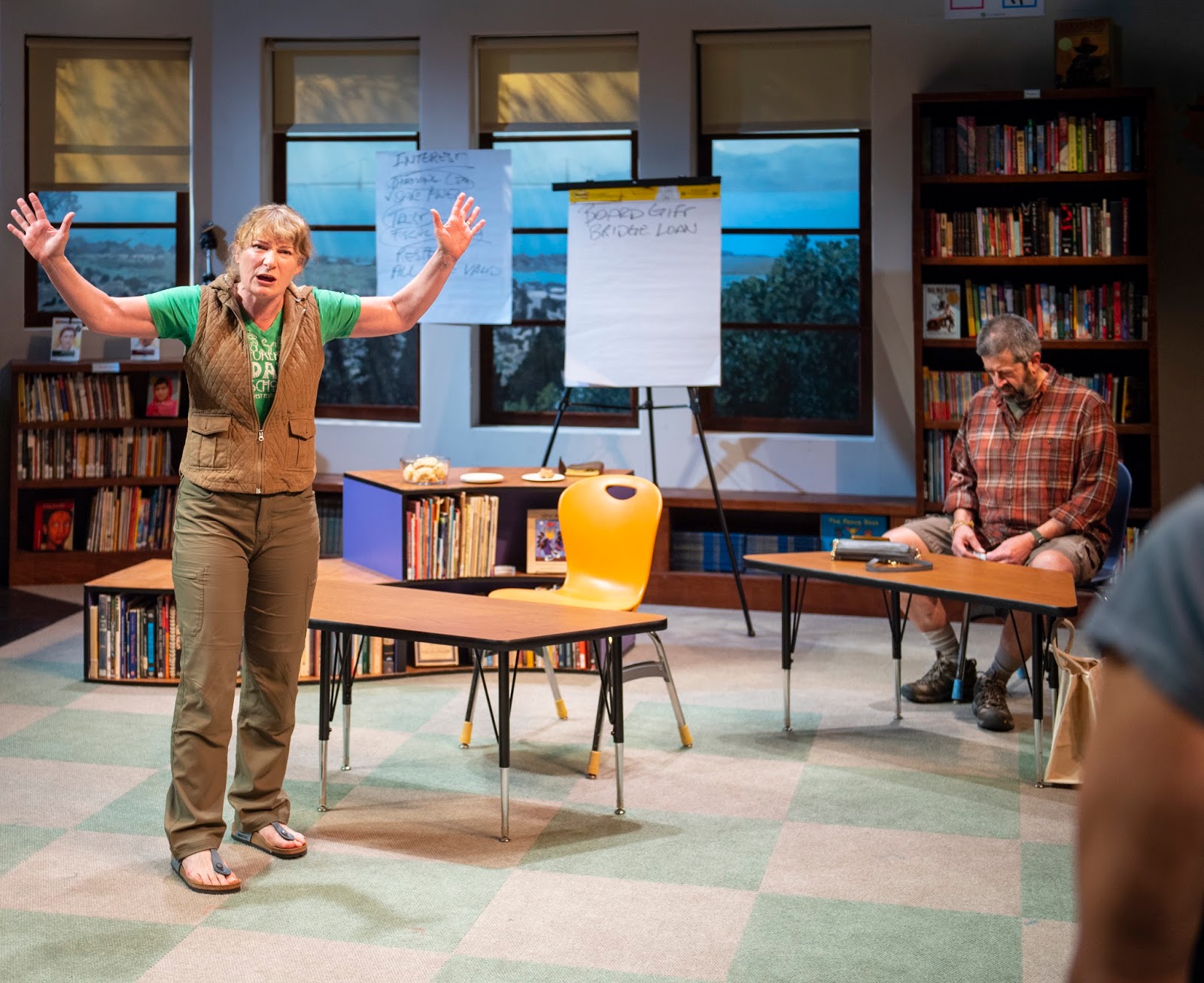 With hands often raised in front of himself as if in prayer, school administrator and board member, Don, tries his sincerest best to facilitate this gathered group, not only leading the aforementioned “spit-balling” of ideas before “unpacking the list” generated and seeing “where we’re landing right now,” but ensuring the members remember such norms as using only non-gender-specific pronouns. Rolf Saxon as Don is exuberant in his joy of being the one to lead the discussions, acting as half cheerleader, half therapist as he gently generates such gems as “Let’s focus on the positive of what we can do of what we can do.”