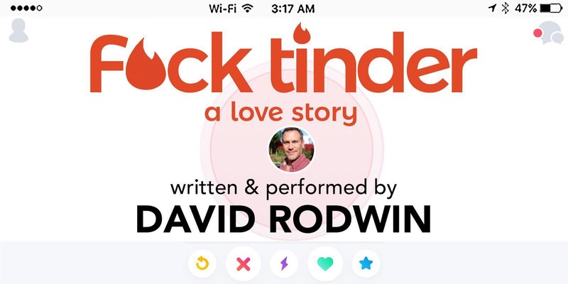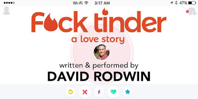 When a show begins with the invitation for the San Francisco, mostly thirty-something audience to yell “Fuck Tinder” so loud that they can be heard in Oakland — and they do — it is clear that we are in for a wild and wooly ride. After all, the nearly fifty-year-old guy before us declares that following a sudden, surprise break-up with his girlfriend, he decided to turn to the dating (more accurately, hook-up) online site Tinder, where he was hoping for “free sex, right now, often weird.” During the next ninety minutes, David Rodwin leaves no bed sheets unruffled as he describes in full, often XXX-rated detail the up’s and down’s of his two-plus year journey swishing right (yes) and left (no way) on Tinder, looking for his true soul mate – and if not that, then at least a hot, one-night stand. Returning to PianoFight for a third and final encore of his F*ck Tinder: a love storybefore heading on a multi-city tour through the U.S., Australia, and Canada, David Rodwin bares it all in a monologue that elicits many laughs and eventually even a few tears.