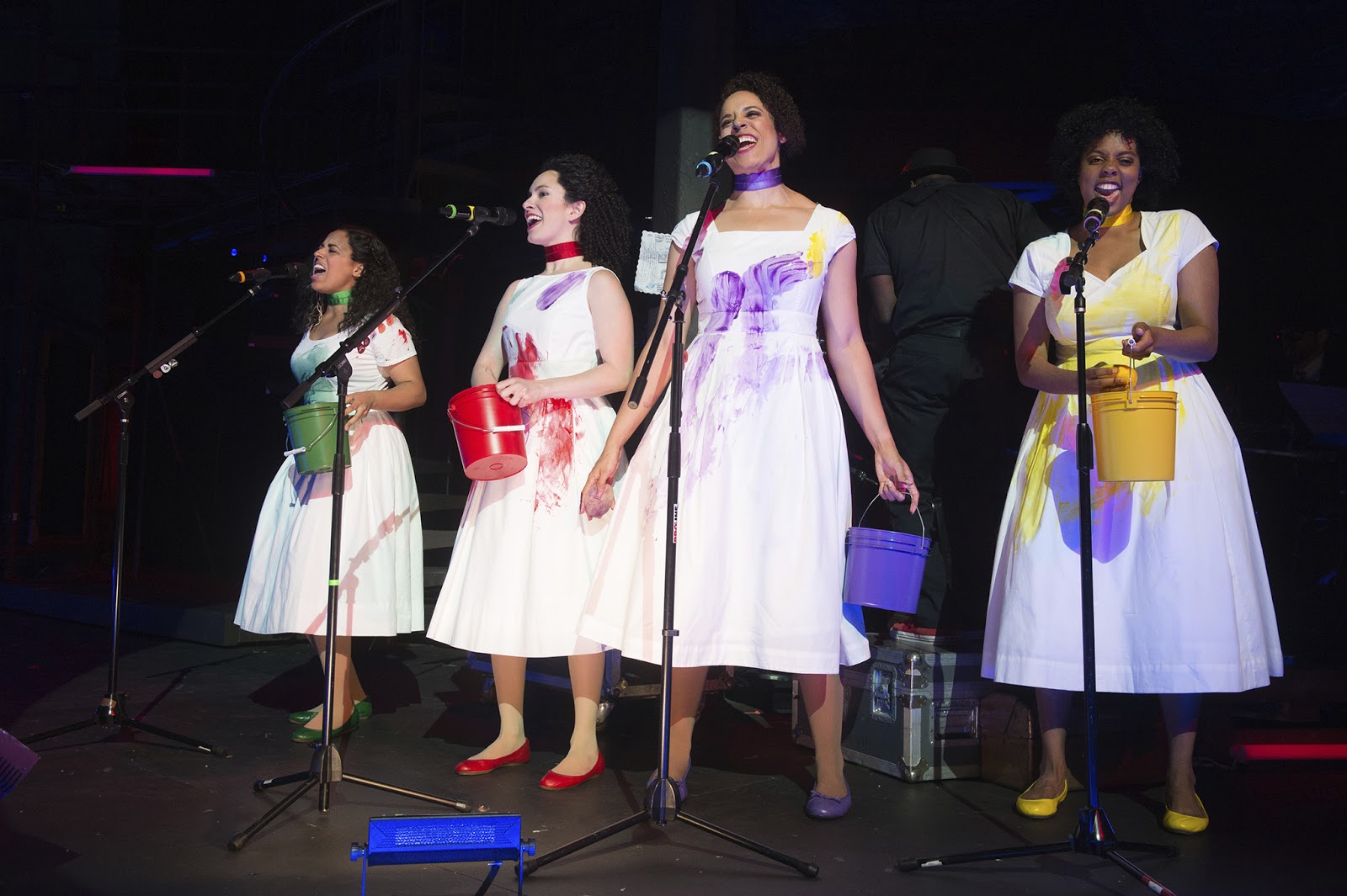 The free-love, flower-child, and frisky-filled days of the 1960s have clearly influenced the increasingly hilarious choices of Director Dehnert and her creative team. The all-white, flowing attires of both royal parties become canvases for multi-colored, paint-brush applications, as the young folk continually apply designs and paint strokes to their own and each other’s clothing (reminding one of scenes from the Summer of Love in San Francisco). Composers Amanda Dehnert and Andre J. Pluess have written multiple tunes that cast and band members occasionally step to the mikes on stage left to sing, songs that have flavors of the sixties in their lyrics about love and in their refrains full of soft-flowing harmonies. The lighting of Japhy Weideman, while not psychedelic, is certainly rainbow inspired, with even the gigantic moon shifting its hues to match the current mood.