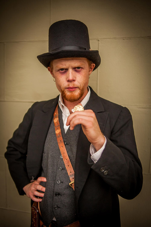 As most high school students know, the Caesar of the play’s title is not at all who or what the play is about at its core; and that character actually has a relatively early demise in the play. But in this production, our Caesar — Libby Oberlin — makes and leaves a lasting impression as a big-smiling, brassy, bold Caesar who dresses in knee-high boots, carries a small whip, and plays always to the crowd of admirers in full swagger. With snide smirk overflowing with an air of superiority, she mocks Cassius in front of the gathered crowd for his “lean and hungry look.” She revels in the crowd’s cheers as she mounts a throne on a float her followers parade about (designed with flair by Edward T. Morris). And when she later delivers the oft-quoted lines of “Cowards die many times,” she spits out the words with a confidence that has an air of saying to the world ‘I dare you to consider harming me of all people.’