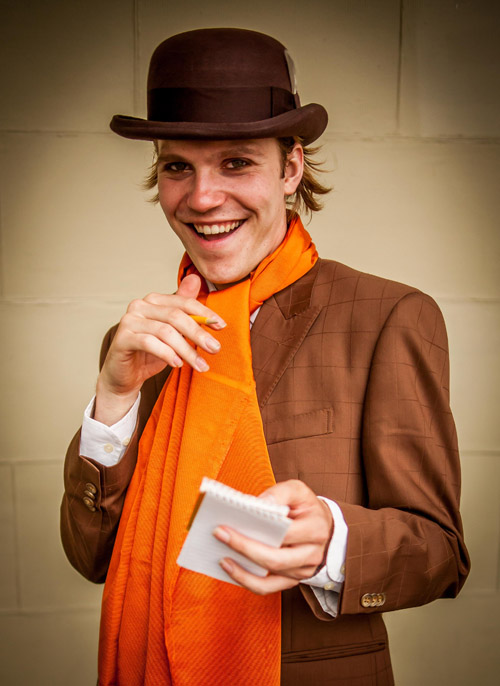 Also memorable in performance is Chris Steele as Casca, a roaming, always smiling reporter who constantly records what others are saying (including audience members he interviews in the opening festival). He has the manner of a gossip as he talks to his fellow conspirators, Cassius and Brutus, and often cackles almost wildly through his toothy grin, usually at times when laughing does not seem that appropriate. Full of many feats of facial gymnastics, Mr. Steele is a delight as the evil but likable Casca.