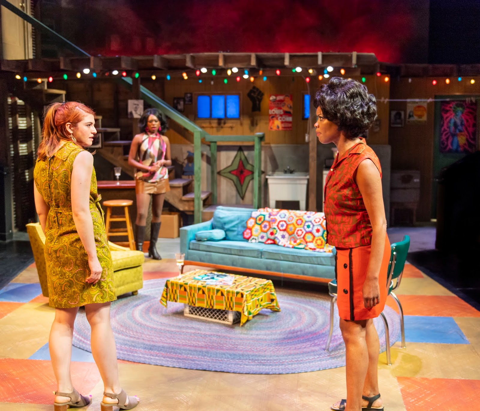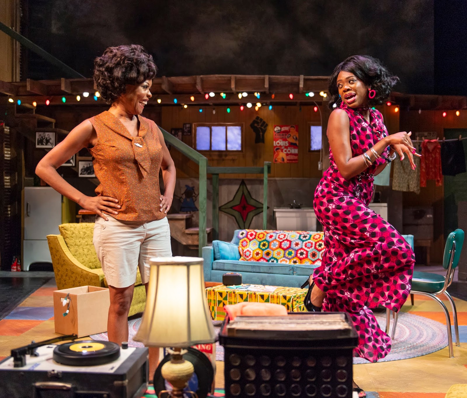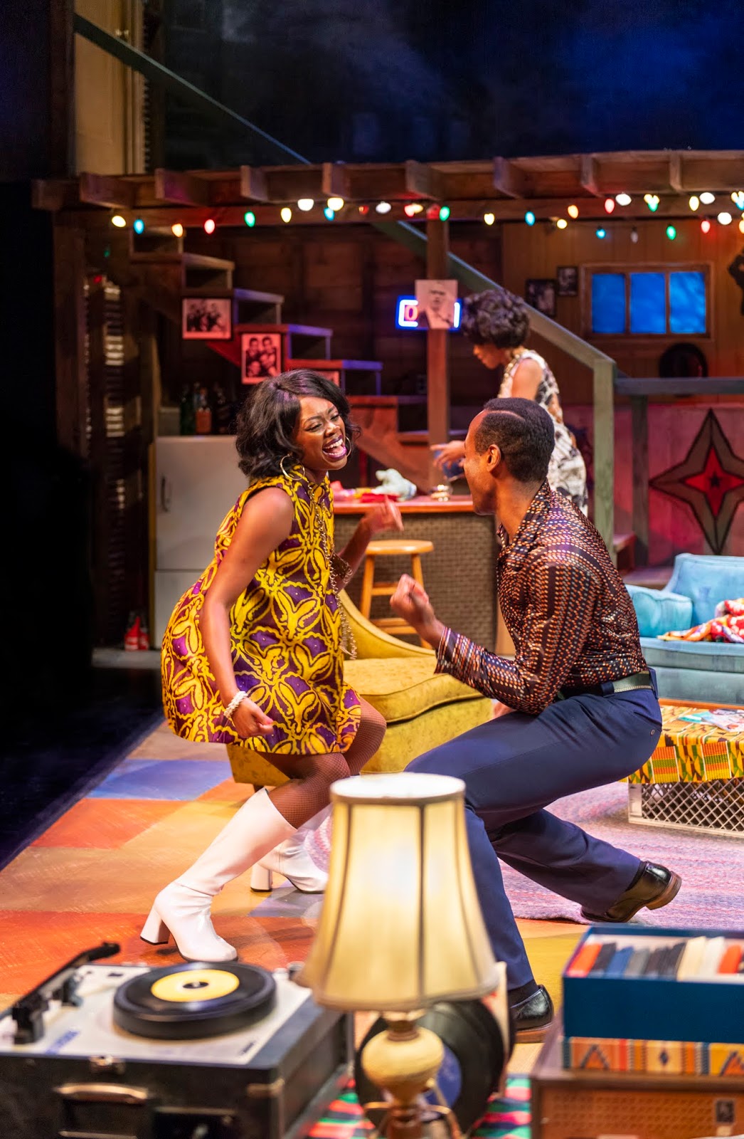 Back-wall steps lead into a basement room that is filled with touches of a family’s history including wall drawings both cute and striking, a colorful afghan probably knitted by a mother at some point, and furniture slightly worn but definitely comfy (all designed with as astute eye to the late ‘60s by Richard Olmsted and with the aid of prop master, Christina Bauer). Chelle (short for Michelle) is having a frank conversation with her record player where the 45-disc of David Ruffin keeps sticking just as he so beautifully tries to croon, “Please don’t leave me girl.” “Don’t go scratching up on David,” she warns with a mixture of fun and frustration as she tries to untangle another string of Christmas lights to add to those already hanging around the room with its small bar in the corner. Chelle and her brother, Lank, are turning later in the week the home they just inherited from their recently deceased and much-adored father into a late-hours dance hall (something quite common at the time in this African-American section of Detroit at 12th and Clairmont).