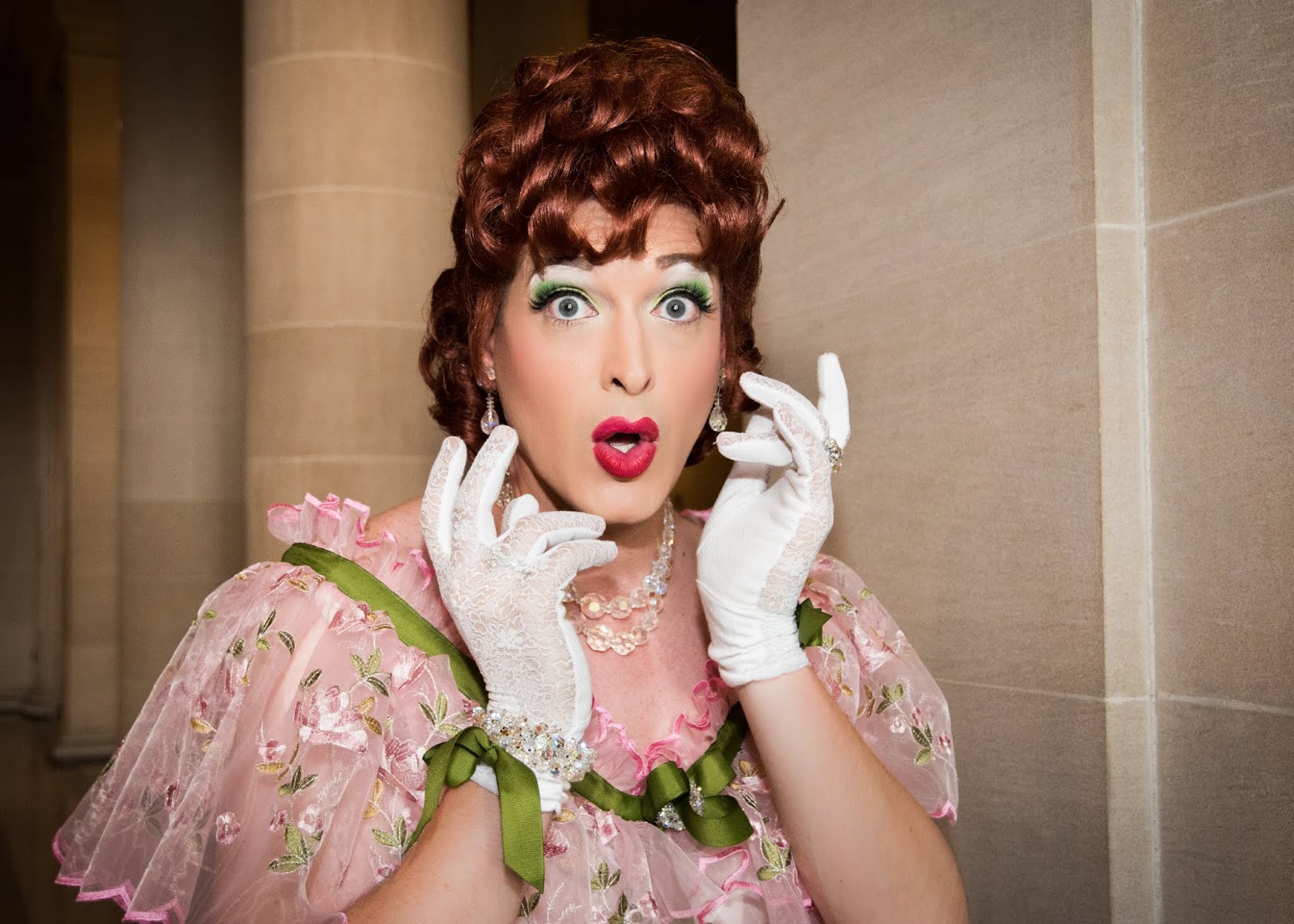 In a city and a theatre center that have both seen their fair share of drag queen performances for the ages, J. Conrad Frank may well deserve to be crowned the queen of all queens. His Mary Dale does not let one moment in the spot light go by that is not worthy of comparison to that famed Silver Screen moment of “I’m ready for my close up, Mr. Demille.” When she brings the house down at one point portraying Lady Godiva, Mary’s lip-synching toe trots across stage are a combined homage and parody of every drag queen’s featured, spotlight solo. And in the many elaborately ordained, eye-popping gowns of oranges, pinks, and greens that Mary Dale dons (a different one with matching hats and heels every time she comes on stage, all designed by Mr. David), she is in fact “Queen for a Day.”