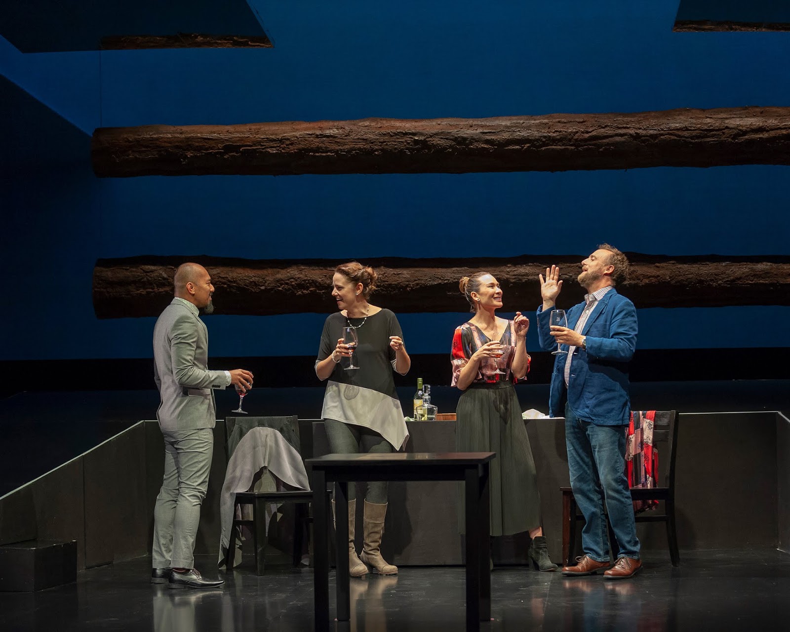 In fact, the word “channel” becomes an even more frequent visitor to appear in the conversations than the oft-appearing word “camping.” There is mention of a “hidden channel” as Daniel says, “I can see him (Ben) seeing us seeing him.” As pairs try to unravel what is real and what is not about their various relationships on both a personal and a professional basis, who is to blame becomes a topic, with sometimes any two claiming to “be on the same channel” or one finally asserting “on some channel, I can see everything, can’t you?” Playwright Chen and Director English corroborate deliciously to involve us in an unraveling of past, present, and evolving relationships where no one – including us – can be quite sure what shoe will drop next nor what is really happening and what might just be all in someone’s imagination. And all along, cultural assumptions and misassumptions keep finding their ways into the already tension-filled conversations.