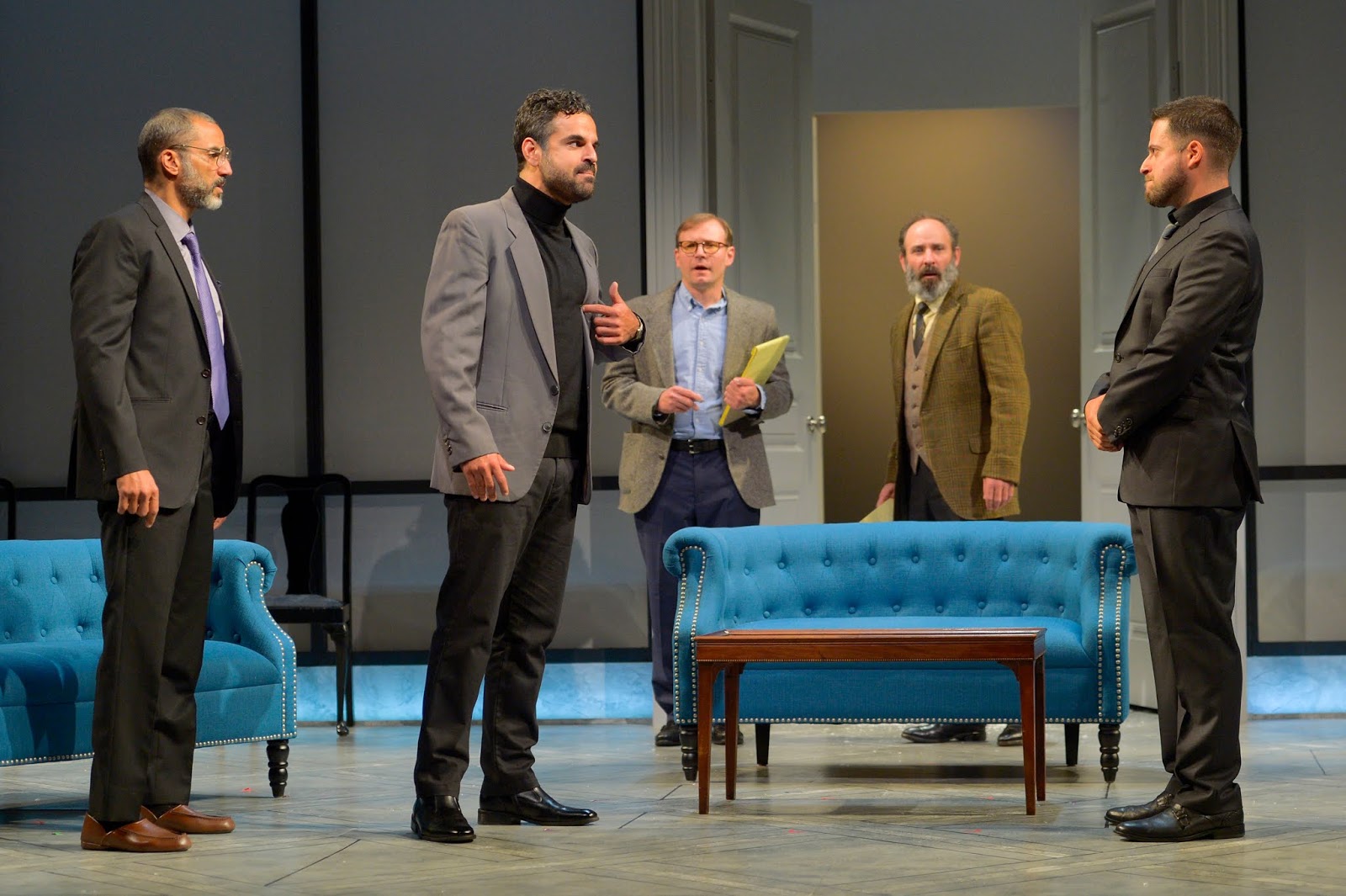 Beyond Terje and Mona, many other personalities parade across the stage, often bursting at the seams with ego, conviction, and self-righteousness. Each leaves a memorable mark on the unfolding drama and in our memories as audience. While difficult to call out every performance in such a large cast, mention must be given to the initially timid and later much more bold professors from Israel — Brian Herndon as Yair Hirschfeld and Ryan Tasker as Ron Pundak – and to their Palestinian counterparts in those initial encounters, J. Paul Nicholas as Ahmed Qurie and Ashkon Davaran as Hassan Asfour. These four all bring a genuine humanity and a believable transformation to men who arrive with no reason ever to like those on the other side of the table, given the atrocities each has witnessed perpetrated by those the others represent.