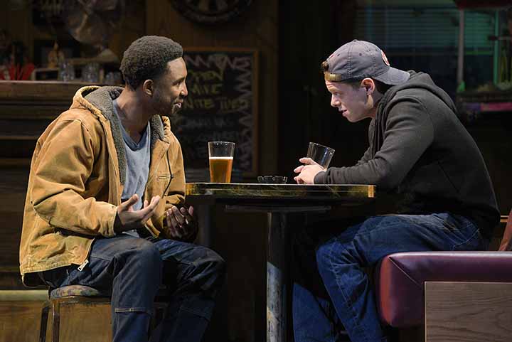The real power of the stories we see unfolding is understanding first-hand the costs beyond cut salaries and lost jobs of what is happening to the lives of people we have gotten to know.  The Tweeted and rally-ranted themes of Trump begin to pop up over and again.  We watch prejudices erupt against a Colombian American who even though born in this country, is accused of being here on his green card to take away the jobs of real Americans.  We watch long-time friends who have been like family – friends both white and black – blast with hateful racial accusations when one who is white (Tracey played by Lise Bruneau) is convinced she is overlooked for a promotion because her best friend is black (Cynthia, Tonye Patano).  Individuals bemoan what is happening to their community with all these newcomers (“Olmsted is not for you”), and they long for the old days “when you got dressed up to go shopping” and when “if you worked with your hands, people respected you.”  Divisions begin to appear among both friends and family members, with dire consequences spiraling out of control due to emotions gone ballistic.