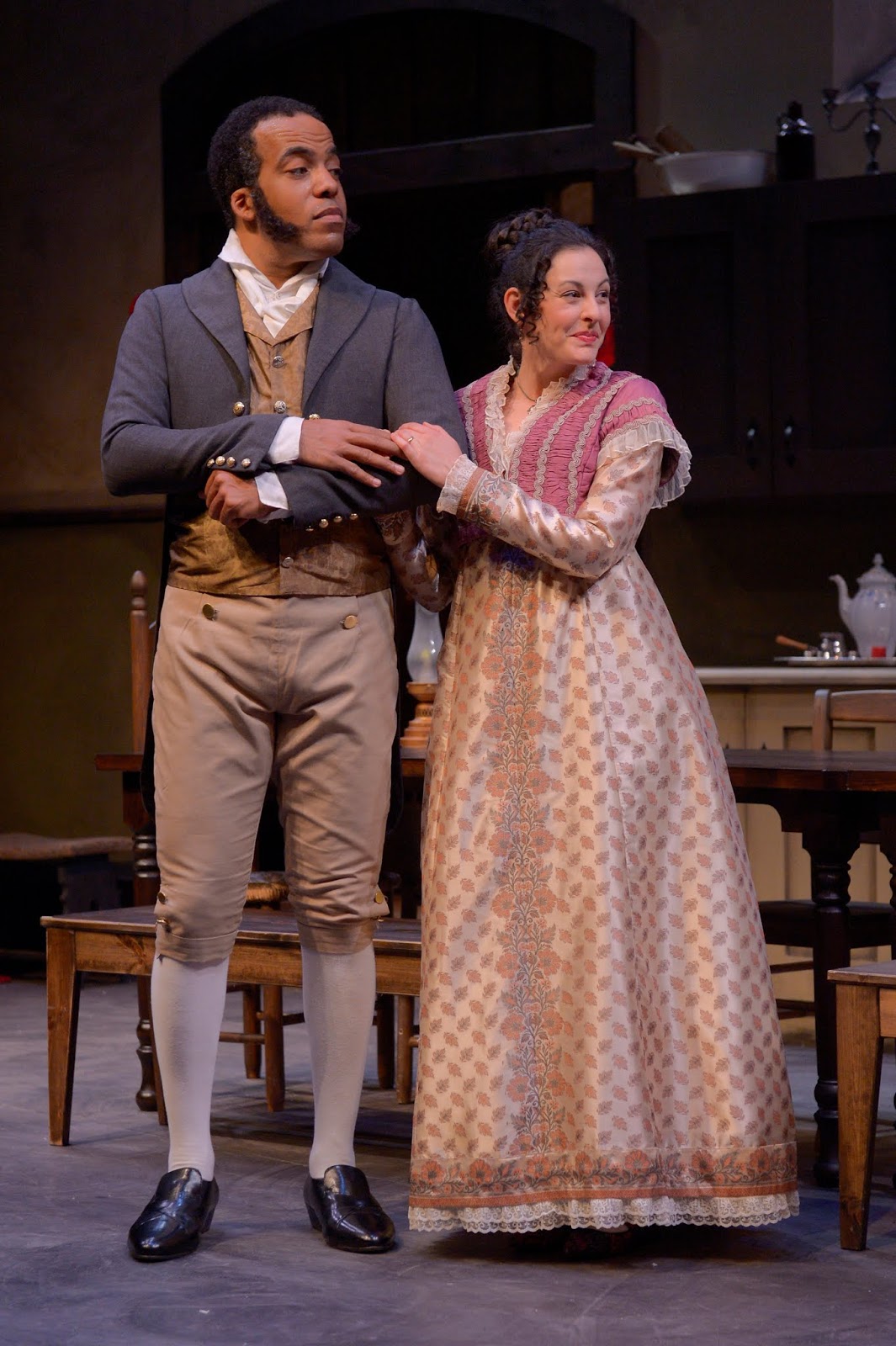 Her husband, Fitzwilliam (David Everett Moore), is stiffly formal, a bit standoffish, but also looking to escape all the sisters and hubbub of the above, asking sheepishly his wife, “Couldn’t I just hide down here until after the holiday?” Wanting also to hide also from the happy couples above is Lydia Wickham (Madeline Rouverol), a high-voiced, fast-talking (i.e., rarely speaks using any punctuation marks like periods) woman who is visiting without a husband because her husband, George, has been forever banned from the household by Darcy after he did “disgrace this house.”