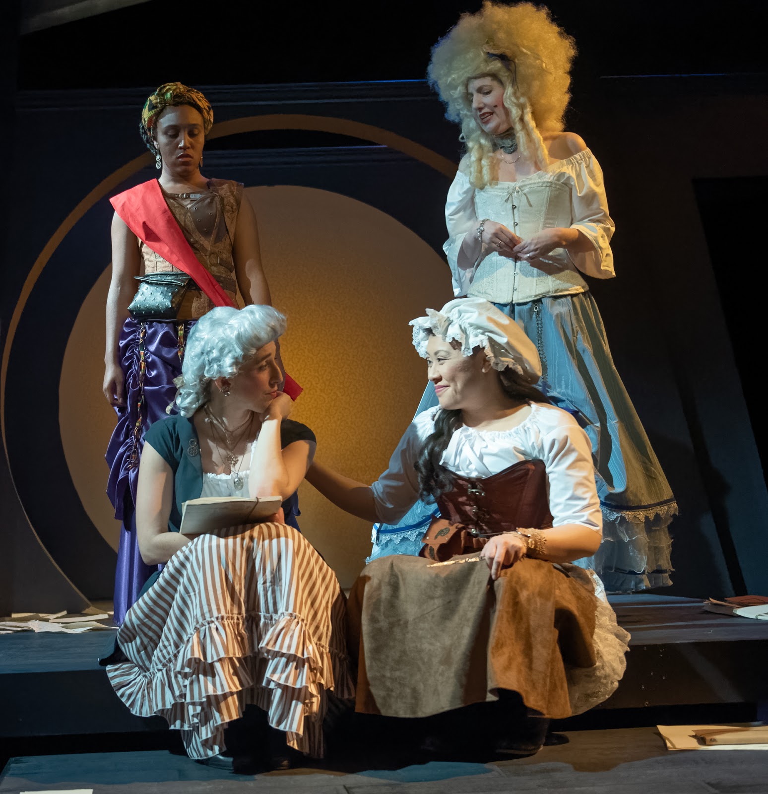 Lauren Gunderson imagines a sorority of sorts forming during France’s 1793 Reign of Terror among four unlikely friends – three real, one fictional – with portraits of their bravery, foresight, and revolutionary spirits emerging in a dramatic play that is also very much a comedy. In a wonderfully conceived and acted production of The Revolutionists by Dragon Productions Theatre Company — their mostly untold/unknown stories reign forth in a play whose brilliant script speaks both truth and fiction as laughs rain down from the audience, even as the scaffold’s blade hangs over the necks of all four.