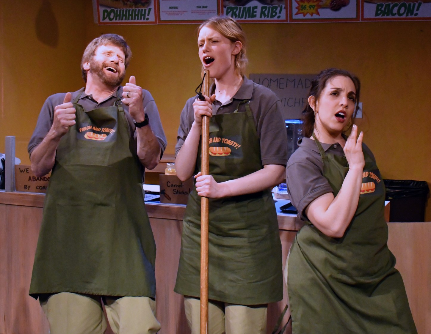 In many ways, Ted is the saddest of the three who are all barely hanging on to what little economic security this job brings. Paul Stout’s Ted is trying so hard in every way to like this job, to see it as a good next step in a career that has imploded on him due to corporate downsizing, and to ready himself maybe to climb once again a corporate ladder – even that of Tasty Sub. With a mouth that often opens to cavernous proportions, he has fascinated reactions of awe to sub shop details that the other two ignore or half-sleep through. He sometimes has moves of a cheerleader in his mammoth efforts to be excited, but he also becomes “not stressed” but “suicidal” as things start falling apart in his newfound job (the only one his MBA has afforded him after months of looking). Mr. Stout becomes an Every Person for all the middle aged folk who find their American dream suddenly become a nightmare due to some decision somewhere on corporate high where cutting a few thousand people will next quarter please Wall Street.