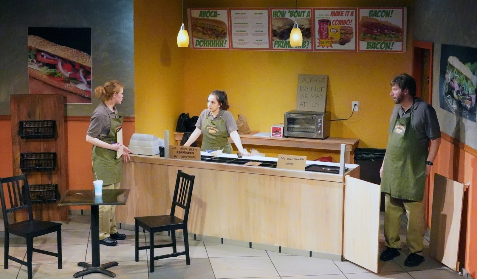 Allie Moss directs this eager cast with a flow that makes good use of frequent scene shifts to use the interim, silent looks and actions of those still on a dimmed stage as a part of the story-telling and character development. To add to the aforementioned authentic-looking sub shop structure, Stephanie Dittbern has gone to the properties kitchen to create an array of deli meat, sliced cheese, and completed sandwich offerings. Ericka Mae Martin’s costumes wonderfully reflect the characters’ backgrounds and personalities while Lynessa Flowers and Brittany Mellerson respectively complete the sub shops looks and sounds with appropriate sound and lighting designs.