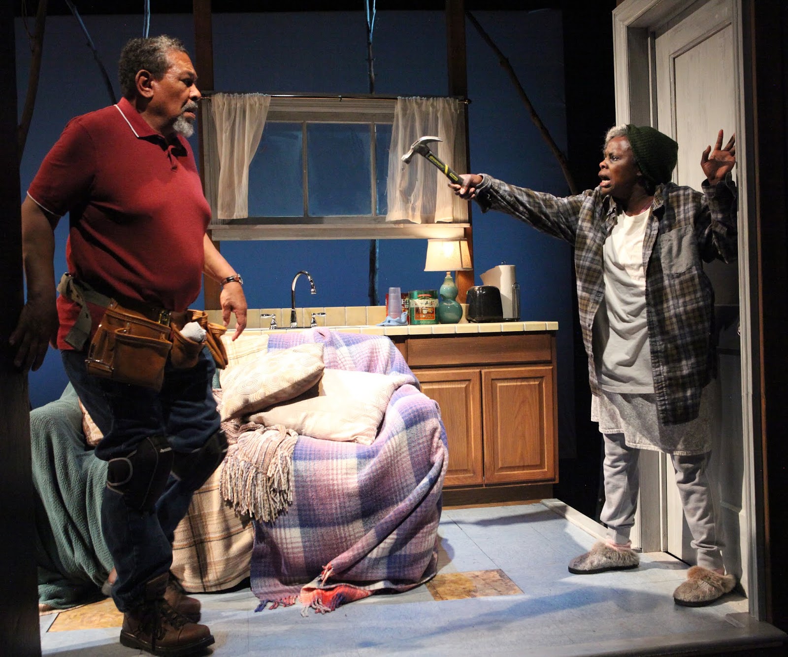 But what we in the audience already know is that there is a third character in Mfoniso Udofia’s play that is unseen and unheard by Azell but very much present for her – and for us. From the other side of the kitchen’s basement door – a door that forebodingly locks from the inside – come knocks and pounds that are like a Morse Code of warning messages to the old woman. When she hears them, her manner goes from a disturbing disquiet to one where her whole being shakes with dreaded terror. The house itself seems to be an entity with secrets of a past that haunt her daily – and especially nightly – with the TV’s gospel music seemingly her only solace. But in those few panels of cherry wood and maybe in this man who is here to lay them, she seems to have some slight hope that “it will stop and I will have …”