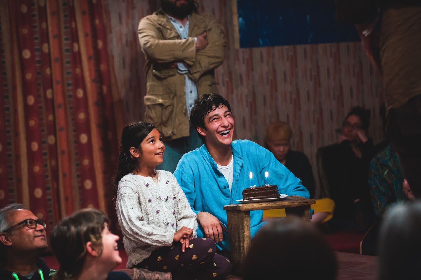 Within minutes, the members of this cast cease to be actors in roles and are instead real people with huge investments in their own and others’ safety, well-being, and dreams. (In fact, several members of the cast were once inhabitants of The Jungle, being refugees themselves who were among the lucky to reach the UK.) John Pfumojena leaves an image never to be forgotten as Okot, the man who stands before us to tell his story of the Sahara truck escape and the ensuing tortures. Nahel Tzegai is Helene, a devout Christian among so many fellow followers of Islam, whose beautiful soul wins her many friends and new family. Khaled Zahabi is a big-smiling prankster and talented pickpocket named Narullah whose smile and eagerness to please wins over Salar the restaurant owner, who in turn makes the boy his Number Two and almost his son. Norullah has an early big-time run-in with Mustafa (Moses M. Sesay) that almost becomes a two-person race war, but the two soon bond into brothers where differing nationalities and skin color are forgotten. Zara Rasti is the adorable Little Amal who steals everyone’s heart in Salar’s café (including all of ours); Jonathan Nyati is the wise-speaking, level-headed Mohammed; and Milan Tajmiri is Omid whose angel-like voice and softly strummed guitar won him and the 200 others an impossible border crossing.