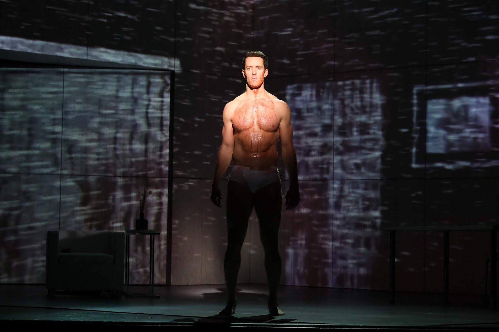 Immediately in the two opening numbers (“Morning Routine” and “Selling Out”), we get a taste of the vision Director Jason Hoover has implemented near flawlessly for Ray of Light’s American Psycho. On the two walls intersecting in an angular corner (Angrette McCloskey, scenic designer), eye-popping projections splash advertisements, New York street scenes, and pop-art-like words like “No, No.” (Video designer Erik Scanlon’s creations will continue to wow the entire evening.) Ensemble members dressed in ‘80s correct-black with just the right slits and tears to be extremely club fashionable (Katie Dowsie, designer) move in mechanistic, robotic patterns with arms, legs, and bodies coordinated almost as if drawn by a video-game animator (only a small hint of the evening’s terrifically imaginative and wildly unusual choreography by Leslie Waggoner). Voices rise in harmonies both harsh and melodic (Ben Prince, music coordinator) while splashes of color red, purple, green, orange (but never pastel) begin to set the evening’s mood through a lighting design by Weili Shi that will later project blood red on the raised hands of the murderous perpetrator, Patrick Bateman. And after several years of my and other critics’ complaints about the Victoria Theatre’s sound system, a newly installed system allows Jerry Girard’s outstanding sound design to reign supreme, including the pre-recorded, accompanying score (i.e., no live band) which normally I detest a company using in live theatre.