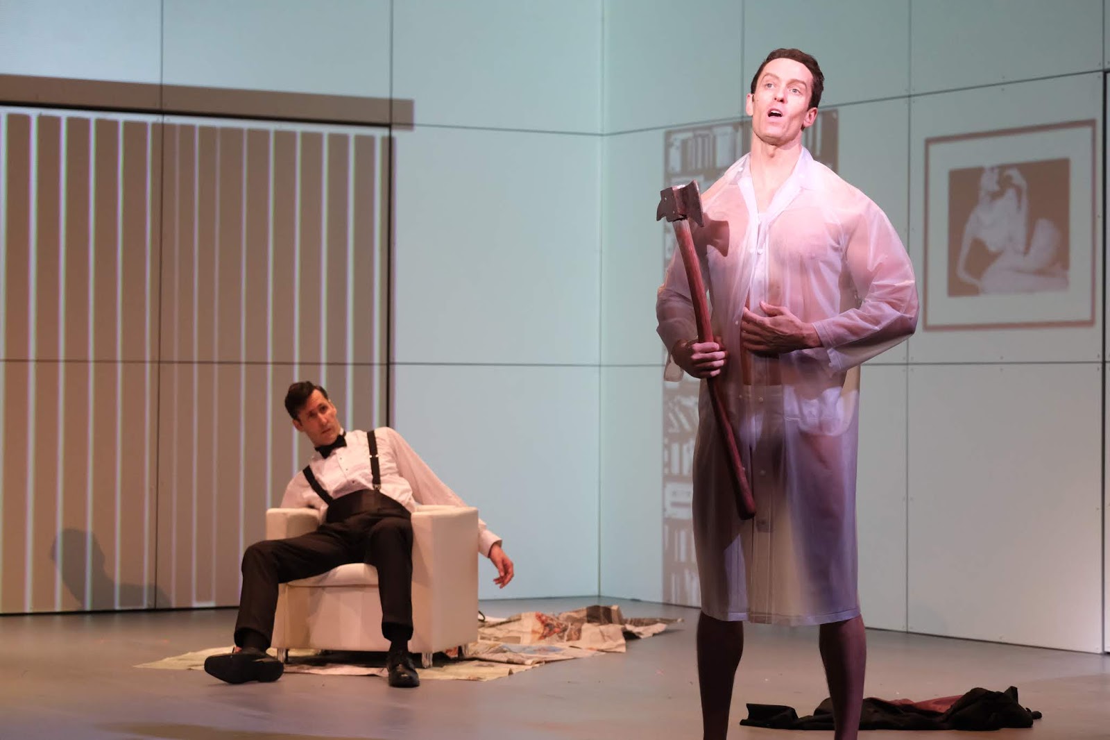 How possible is it that having the perfectly tanned body that has been honed to the hilt so that every muscle tautly glistens, wearing only the latest and most expensive big-name designer wear, and always eating in the restaurants where most can never afford or even get reservations – How possible is it that being this person gives you a free pass to do any atrocity imaginable and for no one even to blink an eye? If you are all this and your name is also Patrick Bateman – big-time, New York investment banker during the Reagan, all-about-me ‘80s — then what’s the problem? Being Patrick means you are home-free to live out your obsession with slasher movies, become in real life your hero Freddy Krueger, and continue to be everyone’s social kingpin even as your hands are covered in your victims’ blood. And on top of it all, you get to be center stage in your $60 Ralph Lauren whitey-tighties in your own musical, American Psycho – now in its slickly produced West Coast premiere as another Ray of Light boundary-pushing, sight-and-sound-exploding musical.