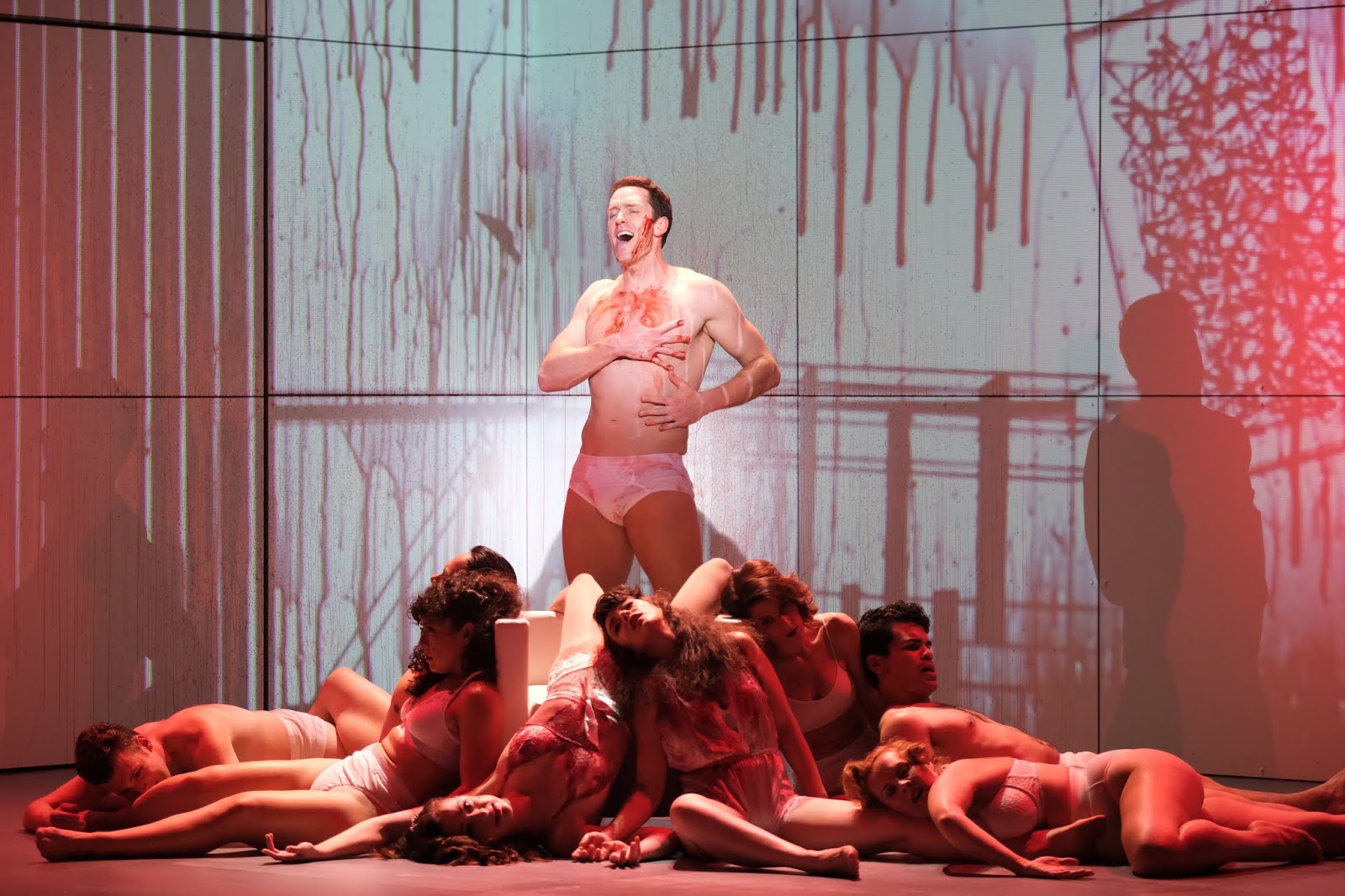 But, OK, we all know that what everyone is waiting for is the first slash of Patrick’s ax; for the next bash with his nail-studded bat; and for wire-strangles, electric-saw demonstrations, and even just plain ol’ sprays of bullets. Yes, kids, these are coming; and they are accompanied by Patrick’s numbers sung first full of gristle-snarled anger, then of frantic desperation, and finally of resigned guilt. Dancers fall as victims only to rise to fall again (“Killing Spree”) while the near-naked, blood-spattered Patrick sings “I Am Back” as floor-strewn bodies echo his disturbing lines while performing their own unique, lying-prone choreography that is marked with life’s last shivers. And no matter that the bloody warning is splashed on the wall for all to see – “Abandon All Hope, You Who Enter Here” – when you are as hotly in societal demand as Patrick Bateman, you are sought and welcomed and loved by all, even if only in your underwear and dripping with the blood while everyone else is dressed in the latest Fifth Avenue designs.