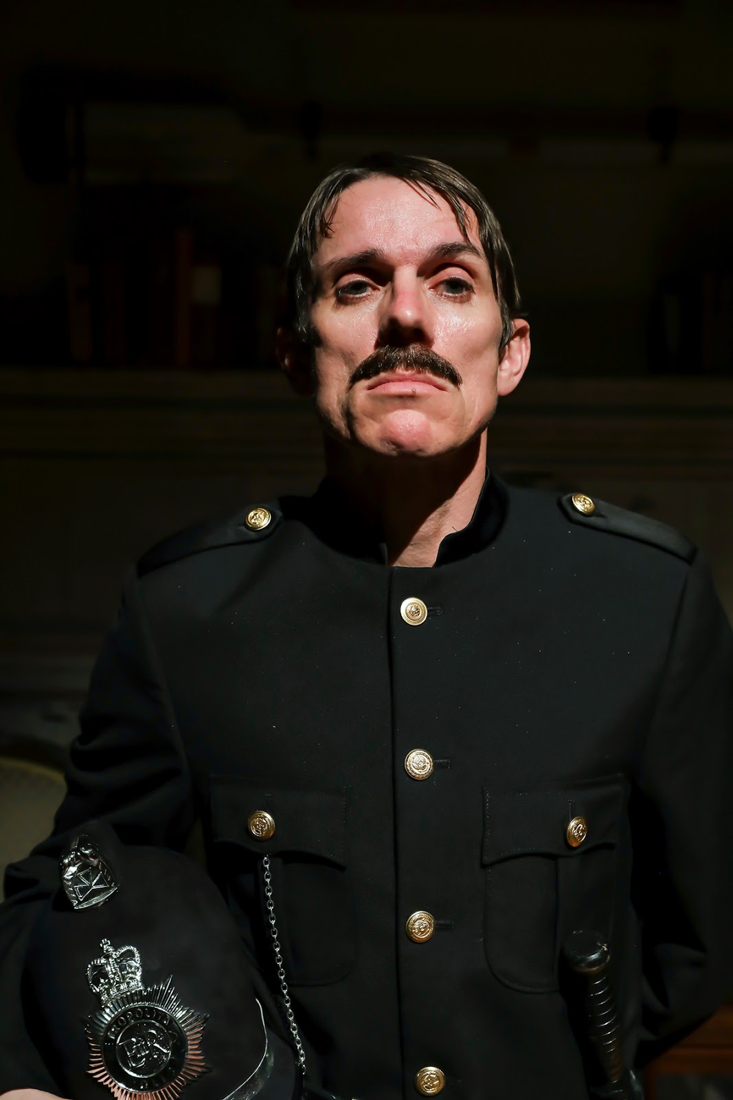 Alan Coyne has the evening’s task of portraying three different, despicable men who enter the parlor and who each eventually becomes the women’s prime suspect as the barbaric butcher of the night. His bent-over, sneering Toddy comes to deliver cat-meat to Valeria, wearing a blood-smeared, butcher’s apron and practically hissing at the non-amused Katie and Loveday. As the local Constable Crane, he is foul-tempered, none-too-smart, but always-superior-to-any-woman (in his own mind, that is), a bobby who pops in wanting to interview all Valeria’s female boarders and to deter any efforts of Loveday in meddling into police affairs.