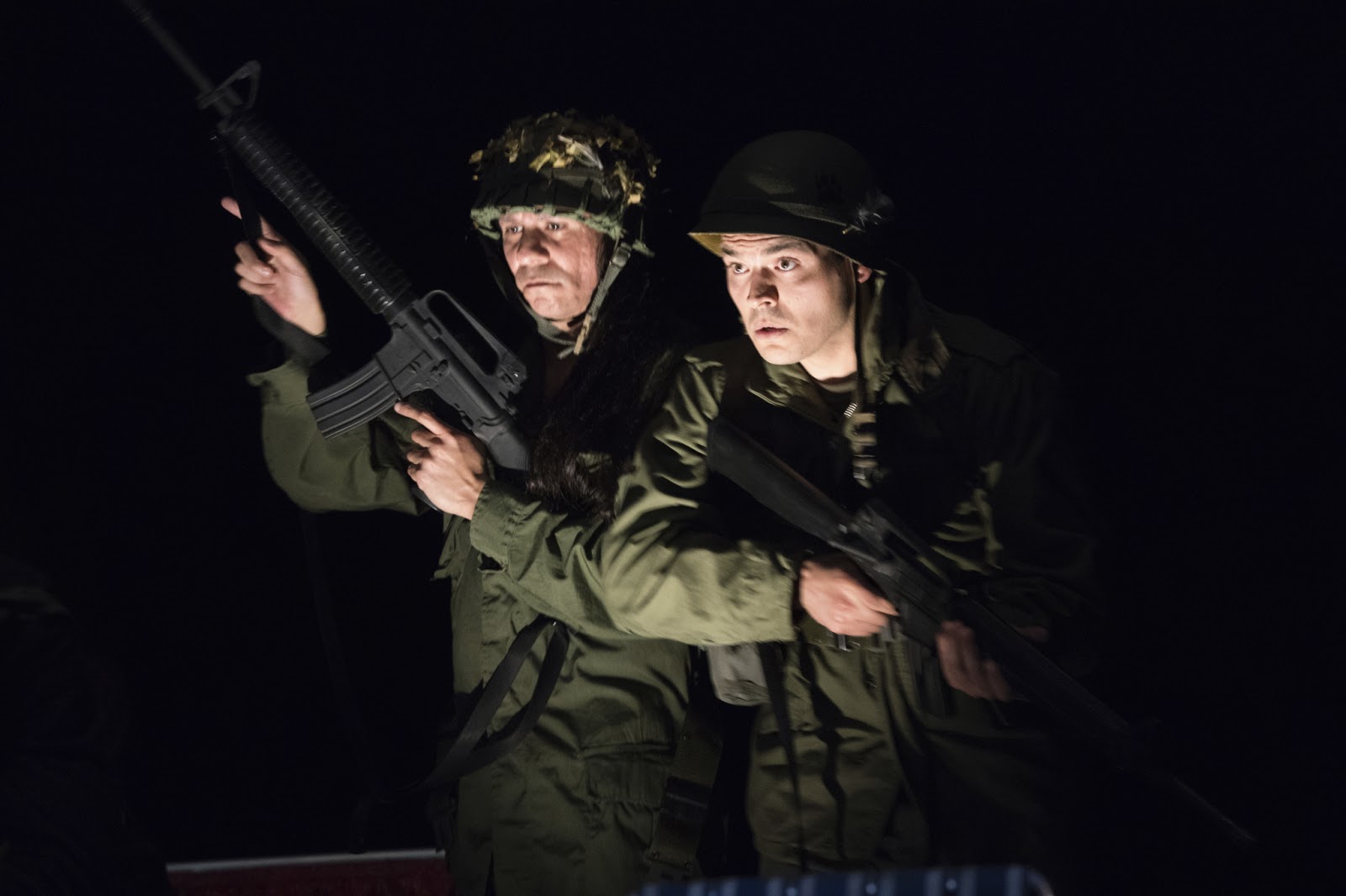 As now-eighteen Eddie (Derek Garza) heads to Vietnam, we watch jungle scenes of scary battles ensue (with a not-so-scary but altogether silly set of jungle leaves dancing about). At the same time on another part of the stage, Shyla Lefner takes the open mike as her Irene gives us a stand-up comedy night version of more Native history that we have probably never heard, ending with a hauntingly sung “My boy, my boy, what have you done?” – one of several the night’s original songs by Ryan RedCorn. She sings looking straight ahead with little expression as we watch the horrific fate of her son that has its own absurd angle in an explosion like none the killing fields of Vietnam actually ever saw.