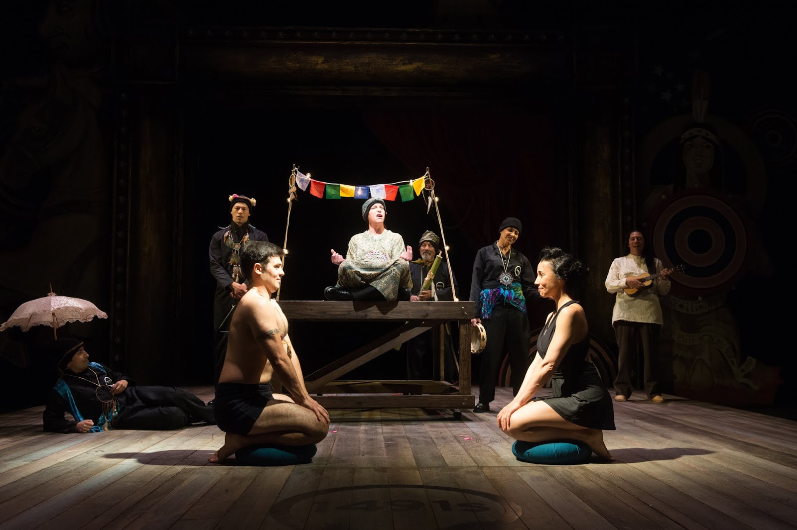 Through it all, Eric Ting directs this multi-role ensemble of eight with clear attention to mess with our expectations and to rattle our white-America thinking to the point of making us pay full attention to the seriousness and tragedy of the history we are witnessing. Regina Garcia’s slightly raised, circular stage includes multiple scenes that appear elevated through the floor or from behind the back-stage’s center doorway, all of which are often as if from a comic-strip’s page. Lux Haac’s costumes are a full wardroom of our many stereotypes as well as tongue-in-cheek jokes about the majority race itself coupled with some costumes that show much respect to the Native elders who wear them. Jake Rodriguez both composes an underlying score as well as a whole host of sound effects that rattle and shake while adding their own reasons once again to laugh aloud. Finally, kudos goes to Elizabeth Harper for a lighting design that sharpens both the humor and the seriousness of the stories we witness while also adding airs of mystery and myth.