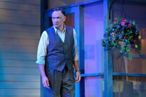 One of the reasons All My Sons is so engaging, believable, and often even funny (at least for a while) are the surrounding characters who drop into the inviting backyard setting of this attractive mid-century home (designed so beautifully by Anna Louizos to give us the feeling of a real community, one that could be in Any Town, U.S.A). Next door in the home the Deever’s once lived are Dr. Jim Bayliss — an oft-funny, hen-pecked husband who sees more than others realize, played by Cassidy Brown — and his wife, Sue — Elissa Beth Stebbins as a sometimes blunt woman who is not bashful to express to Ann her resentment of the “Holy Family” next door, especially of Chris whom she believes is leading her bored husband to be too idealistic.