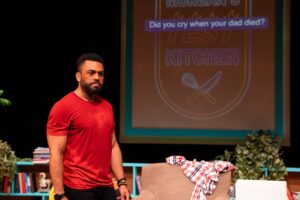 City Lights Theatre Company stages the both delightfully hilarious and deeply moving world premiere of Vincent Terrell Durham’s Running After Shadows. The one-hander features James Arthur M. in the role of a Black, gay, and single Morgan as he brings back to his current consciousness the events and people who shaped — for good and bad — who he is today. The result is at times outrageously funny, at times searingly sad, and in the end both heartbreaking and heartwarming. James Arthur M. — under the astute combination of whimsical, sensitive, and boundary-pushing direction of Aldo Billingslea — with his immediate likeability pulls us in as part of his loyal, online audience and brings us along on a journey that provides him dozens of opportunities to more than prove his stellar acting abilities.
